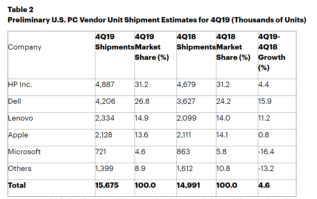 2019年第四季度美国PC市场增长4.6%,台式电脑的销量自2014年以来首次出现两位数增长(参见表2)。