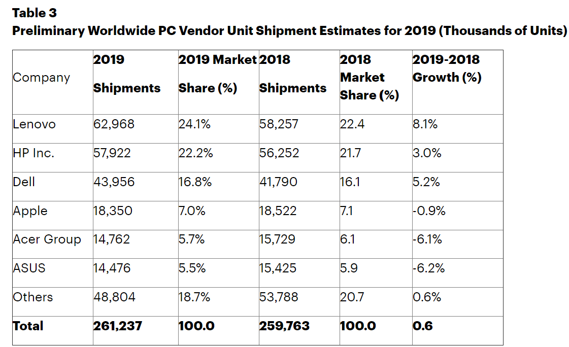 2019年全球PC出货量总计2.612亿台 (见表3)。这是七年来全球PC市场首次出现增长。
