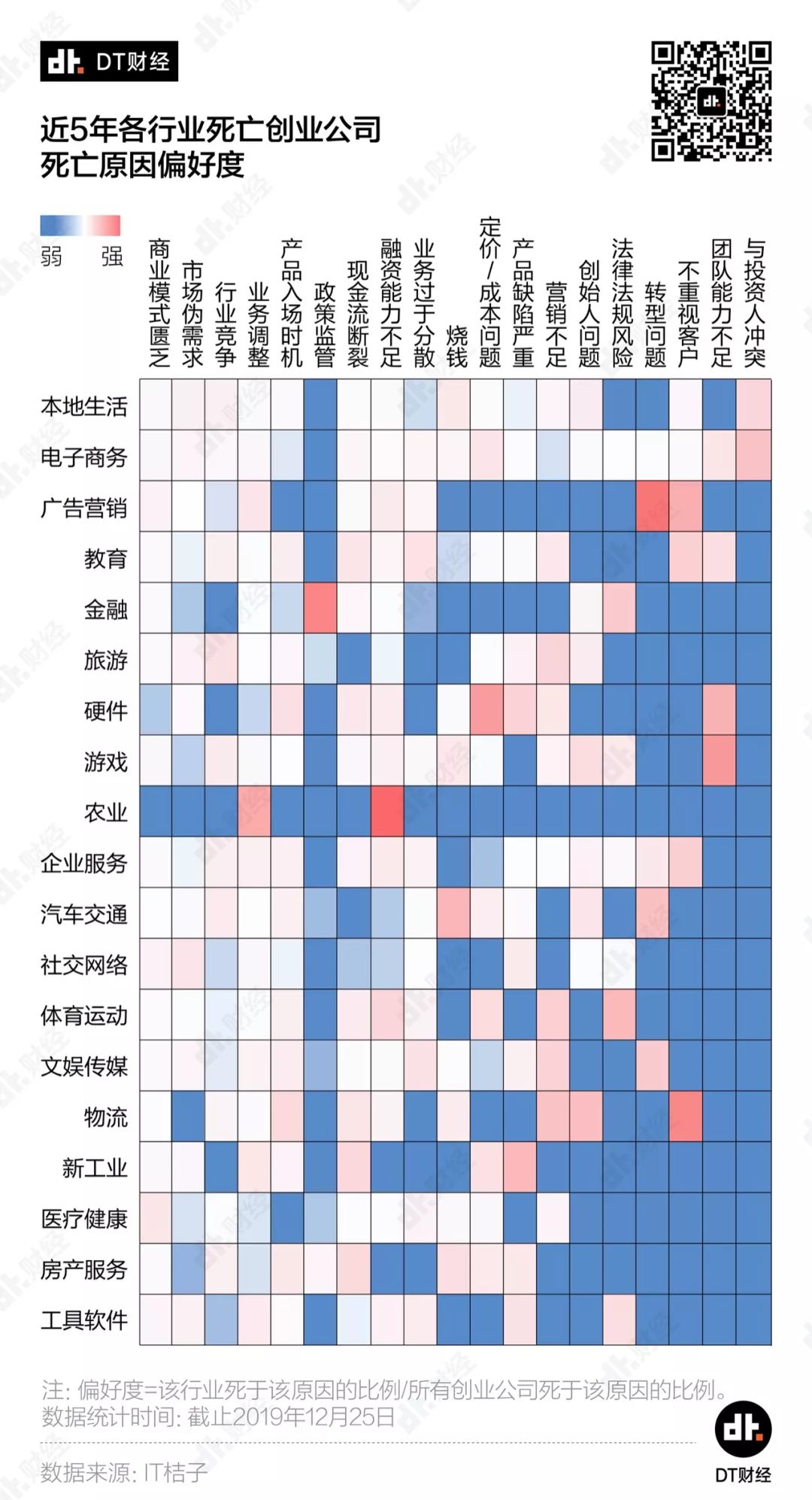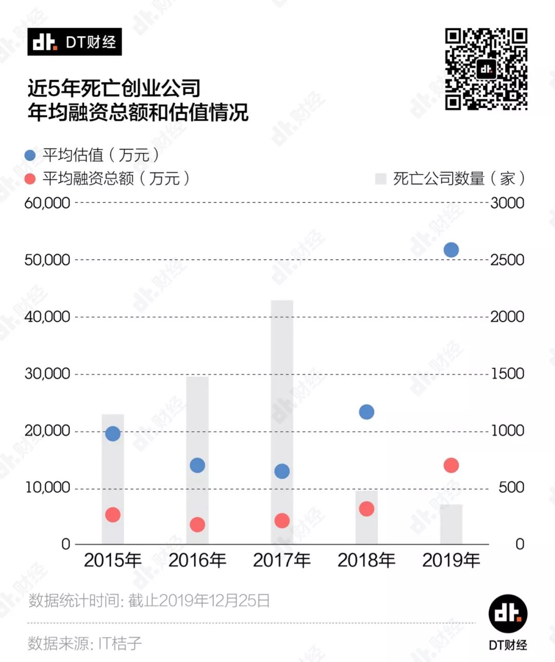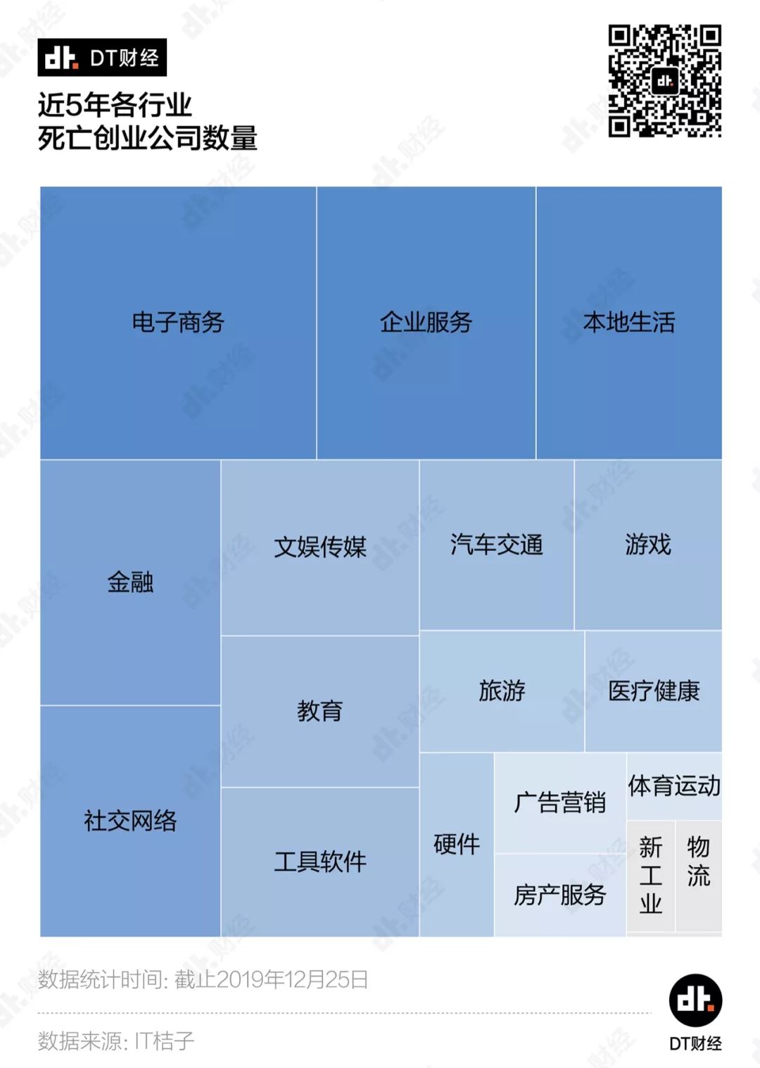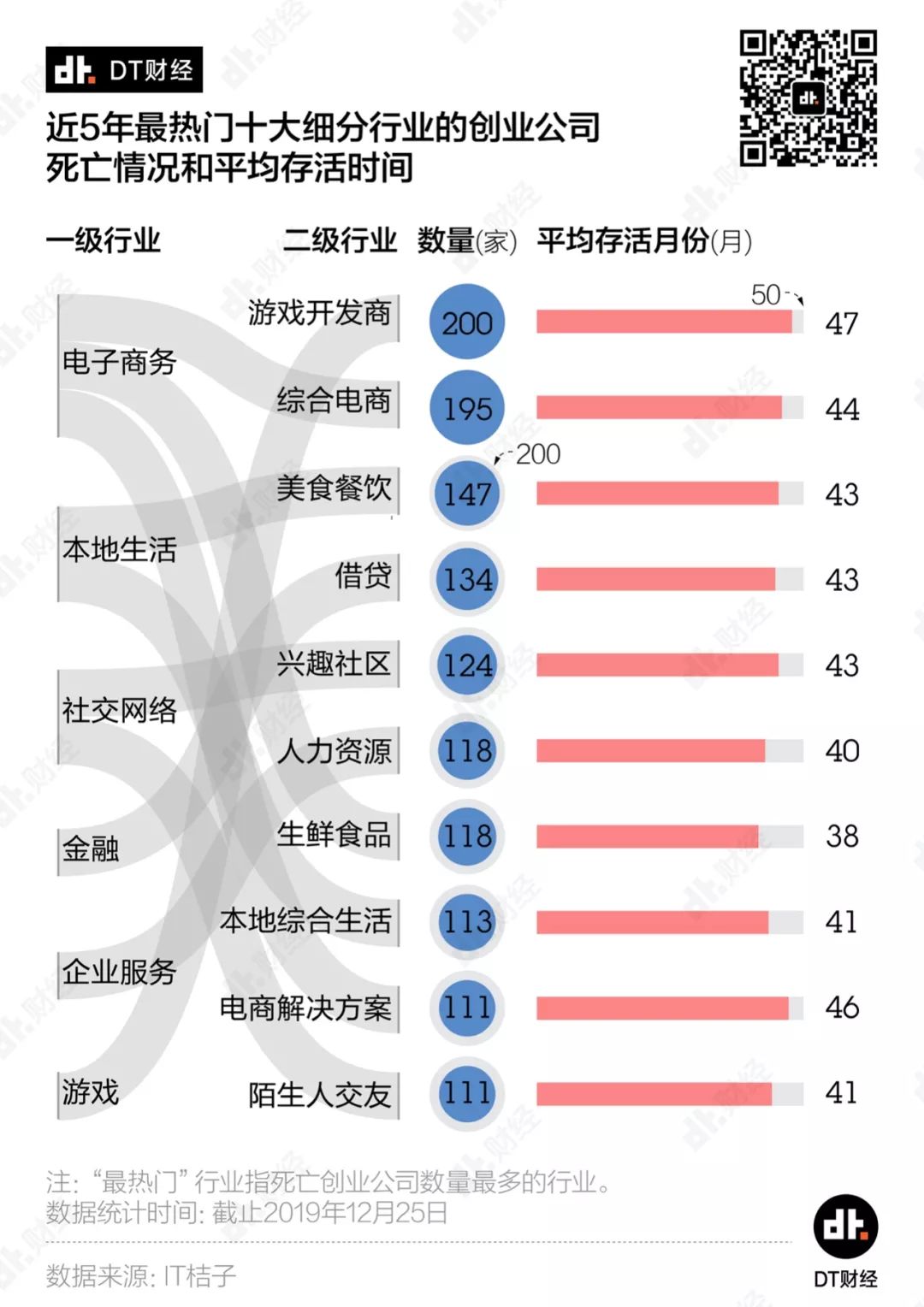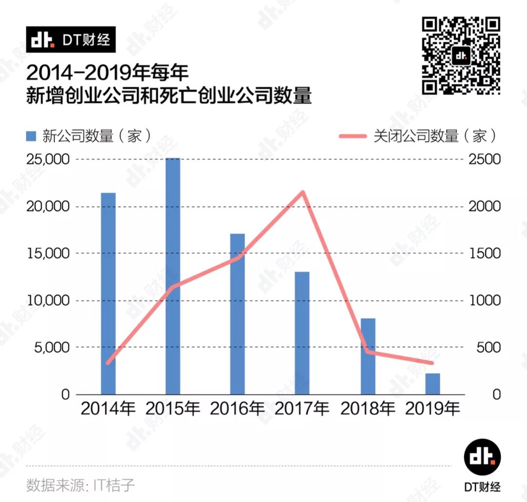 2018年底,科技创投媒体36氪在某篇盘点文章的结尾慨叹道:2018年,水大鱼大的移动互联创业黄金10年,就此画上了句点。一年过去后,我们真切地感受到了这个句点落下后的寒意。被《财经》写道“那么多的钱和那么多人的青春烧掉了,留下一个好故事”的ofo,在2019年还是没有续上现金、振作重来;踩在风口上杀入市场、改写竞争规则的熊猫直播,在2019年3月正式关站;锤子科技将旗下的手机业务和坚果品牌转让给了字节跳动……而站在公司背后、曾经风光无限的明星创业者:戴威、王思聪、罗永浩,相继因公司债务纠纷,被列入“限制高消费人员名单”。这些明星创业公司都撑不住的寒流下面,还有许多没能霸占头条的、悄无声息的“死亡”。我们想知道,这几年,哪些赛道倒下了最多的创业公司?它们都是因为什么原因倒下的? 1、2019年倒下的创业公司 平均多烧了125%的融资我们发现,来到2019年,大家的创业热情愈发稀薄,投身创业的勇士又少去许多。在2015年的创业高潮过后,新增创业公司的数量就逐年下滑。当我们认为2018年已经是一个底时,数据却告诉我们还能继续往下探一探。2019年全国仅新增了2324家创业公司,这个数字不到2018年的3成,更是只有高峰期2015年的1成。当然,我们看到,2017年之后,每年关闭的创业公司也大幅减少,但这并不意味着现在创业公司的“死亡”情况就比较温和。我们发现,2018年之前关闭的创业公司中,有8成以上是倒在未获投/投资不明确的阶段,在资本充裕的那几年,大量涌入创业大潮的小微企业,连说服投资人的想法、计划或者故事都拿不出来,“出师未捷身先死”也算是正常的自然淘汰。从2018年开始,由于小微企业死亡数量骤减,看起来创业公司的“死亡”规模确实是小了很多。但就是这批更少量的公司,烧掉了更多的钱。如果把一家公司关闭前的融资总额当做其烧掉投资人的钱,近5年,5000多家死亡创业公司总共烧光了460亿融资总额。更细致地看,2019年“死亡”的创业公司,平均每家烧掉的钱是2018年时的2.25倍、2017年的3.45倍。也就是说,这两年,创业公司“死”得更加惨烈、更有排面。近5年的创业公司死亡名录里,融资总额排名前10的公司中,有7家倒在了2019年,包括“独角兽”公司团贷网和爱屋吉屋、由云峰基金领投的全峰快递,还有让王思聪陷入限制消费令的熊猫直播……从A轮到E轮,融资总量达22亿元、估值飙升至78亿元,爱屋吉屋只花了15个月。当时,爱屋吉屋是全世界独角兽里发展得最快的一只。但由于未能完全吃透行业逻辑,爱屋吉屋终究还是昙花一现,在2019年初惨淡收场。在市场上成功融到这么多钱,证明上述公司至少在踩中风口、团队运作、商业故事等诸多层面中,做对了好几件事。可惜的是,它们都在2019年渡劫失败了。2、哪些风口倒下了最多的创业公司?“站在风口上,猪都能飞起来。”每每提及创业,雷军的这句话总会被搬出来。但现实是,有些风口实在是挤了太多的猪,再加上风也不是那么持久强劲,所以摔下来的就格外多。这些年我们耳边飘过的风口热词换了好几轮,“O2O”“共享经济”“电子竞技”“互联网金融”……哪些才是堆积了最多创业公司“尸体”的口子呢?数据显示,最近5年,电子商务、企业服务、本地生活、金融和社交网络成为“摔死”最多创业的行业,为创业公司“死亡”名录贡献了过半成员,可以称得上是创业死亡五大兴趣小组。如果按照不同年份来看,各年还会有特别突出的行业,代表了当年的创业“死亡”特色。比如说,2019年教育行业取代了社交网络排入前5,2017年则是文娱传媒行业取代了金融。当淘宝、京东和拼多多获得成功时,尚品网、明星衣橱等电商平台接连涌现,意图在细分市场上分一杯羹;饿了么、美团改变了我们的生活习惯,按摩O2O功夫熊、上门做饭的好厨师等平台都想坐上这班“致富特快”;而在社交这条赛道上,更是有主打匿名的无秘一时风头无两……不过,上述这些名字,最后都进入了死亡名录。在将创业赛道划分得更细之后,我们更清晰地看到了创业公司的热门死亡方向。以5年作为一个大的观察周期,游戏开发商、综合电商、美食餐饮、借贷和兴趣社区是倒下创业公司最多的5个细分赛道。我们特别注意到,被今日资本创始人徐新称作“电商最后一个堡垒”的生鲜食品赛道,公司在“死亡”前能支撑的时间相对更短,近5年该行业死亡创业公司平均存活时间仅有38个月,比游戏开发商足足少了半年多。创业这阵风刮得太快,在粗犷地按照行业观察时还不太明显,进一步细分后,风向的变幻莫测就显现出来。即使是扎堆“死亡”,赛道的轮转也十分迅速。从2015到2017年,游戏开发商、综合电商和本地综合生活都是创业死亡赛道的大热门,但近两年却明显降温,热门度排名大幅下滑,取而代之的是借贷、理财和生鲜食品。所以,关于过往死亡赛道的总结,也并不能帮助我们发现2020的机会或者大坑。不过,抛开赛道的区隔,在创业公司的死亡原因中,还是有一些通性可以参考。3、创业公司都为何而死?众所周知的原因,近两年投资人变得更加谨慎,市场上的钱也紧张了许多。根据IT桔子的数据,自有记录来,机构的投资总额每年都在上涨。但在2019年出现了向下的拐点,机构投资总额第一次出现同比下跌,跌幅达21.8%。一个公司走向结束,大多也都是跟没钱相关,但是大家把自己倒腾到没钱的手段,却各有