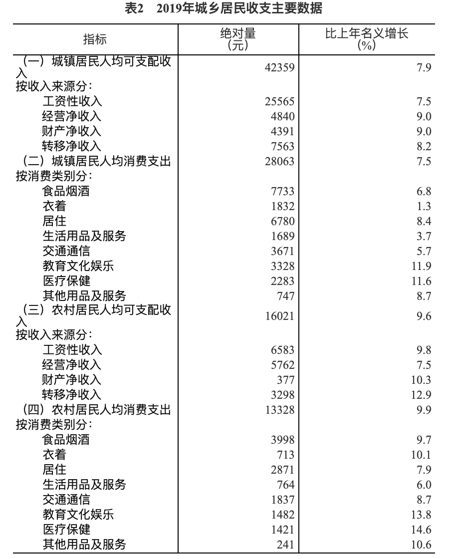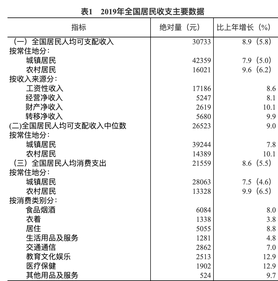 2019年,全国居民人均可支配收入30733元,比上年名义增长8.9%,扣除价格因素,实际增长5.8%。其中,城镇居民人均可支配收入42359元,增长(以下如无特别说明,均为同比名义增长)7.9%,扣除价格因素,实际增长5.0%;农村居民人均可支配收入16021元,增长9.6%,扣除价格因素,实际增长6.2%。