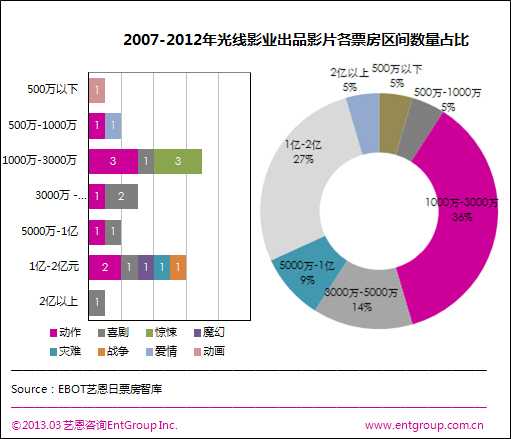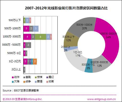 从2007-2012年光线影业发行和出品影片的票房区间占比和类型影片票房区间分布来看,公司发行的惊悚类影片票房较稳定,6部处于1000万-3000万区间内,其中三部为光线影业出品。喜剧类影片和动作类影片票房分布较广,2009-2011年出品的“囍事”系列三部票房节节高登,是为系列影片思路的先行实践。仅有一部的灾难片(《大海啸之鲨口逃生》)和魔幻影片(《画壁》)均取得不俗收益。