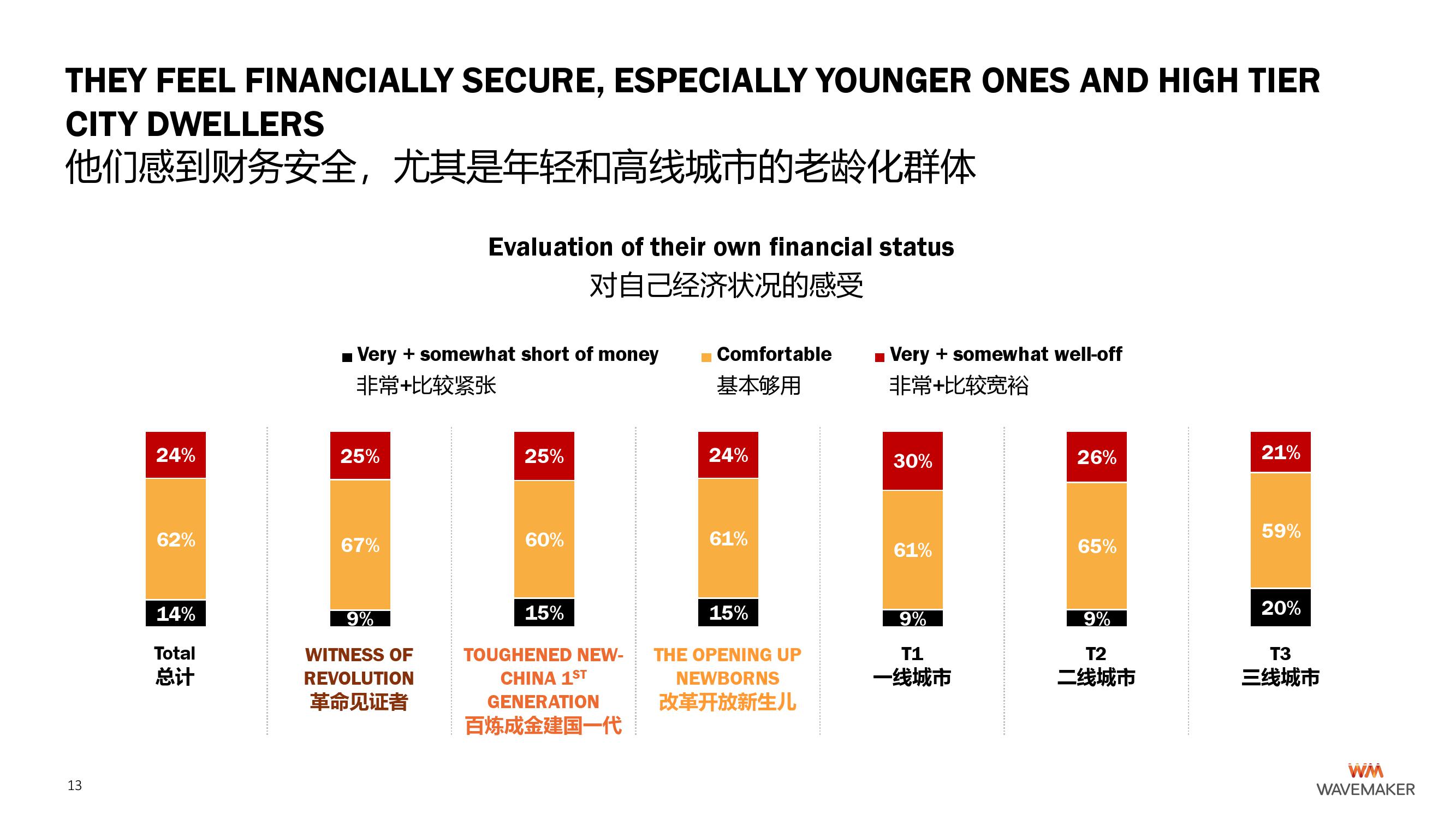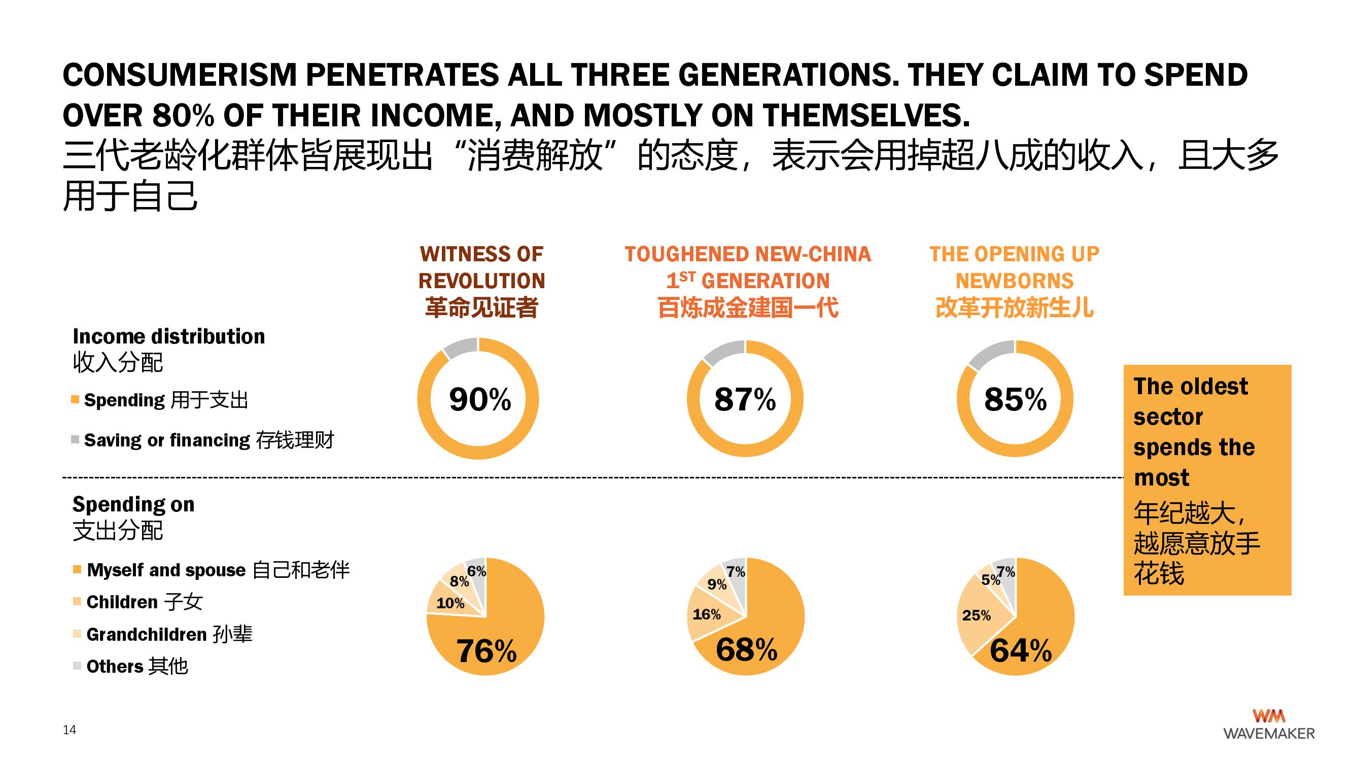 报告预估,中国一到三线城市老龄化群体的消费实力高达年均6.64万亿人民币,远超不同机构的评估结果。而其收入结构也呈橄榄型,逾七成处于中高收入水平,是不可忽视的消费中坚力量。他们的财务安全感和舒适感也较高,三个代际皆展现出“消费解放”的态度,表示会用掉超八成的收入,且85%以上都会用于自己或配偶。
