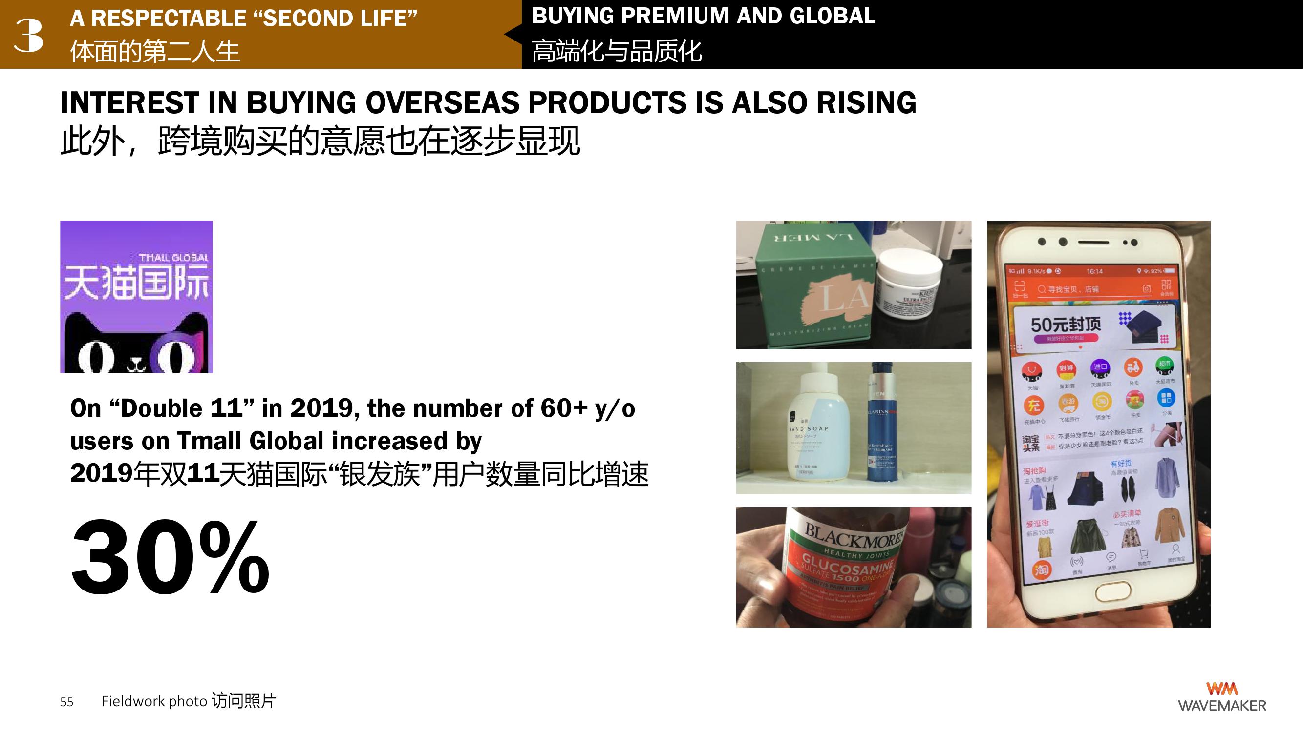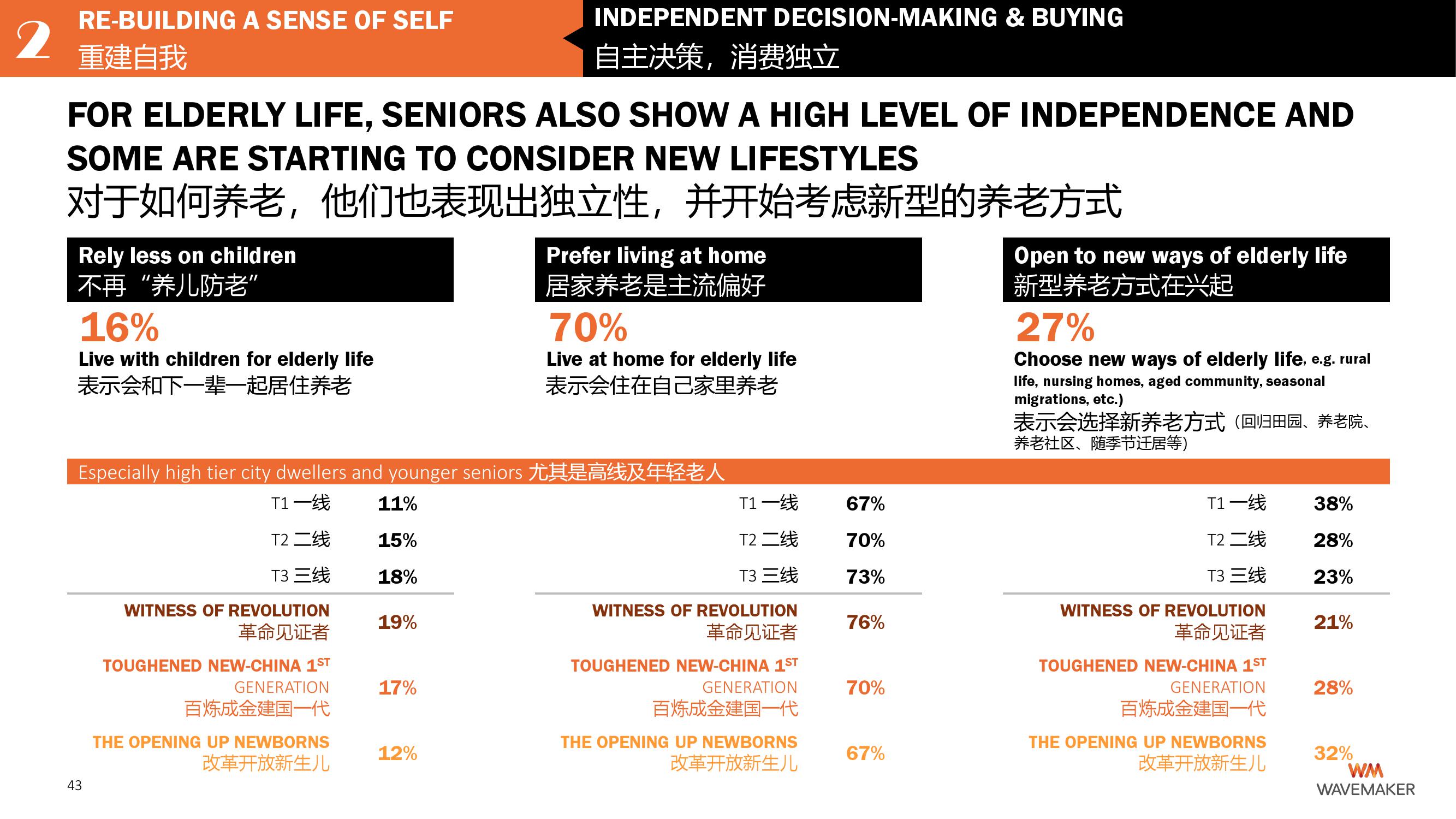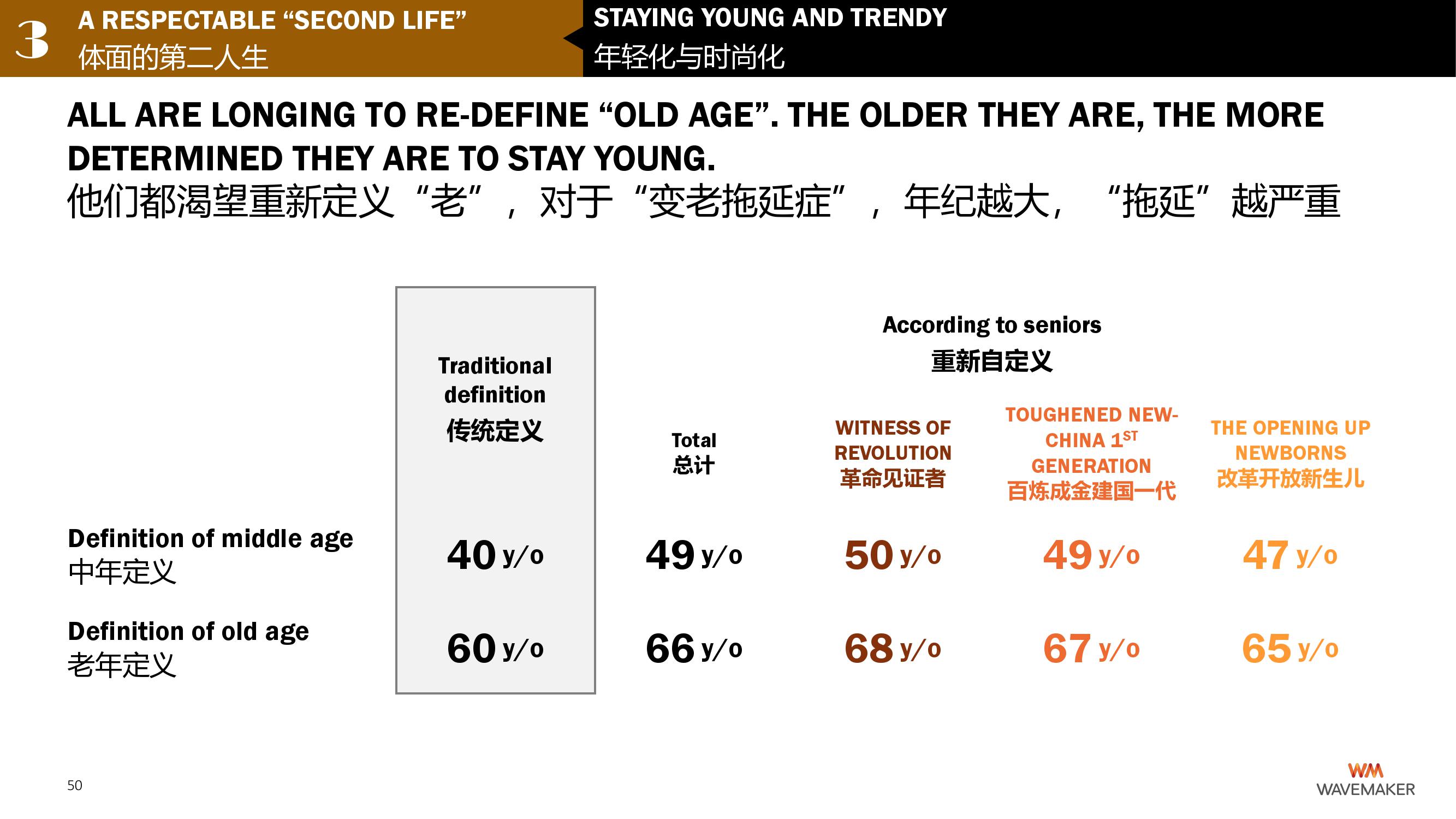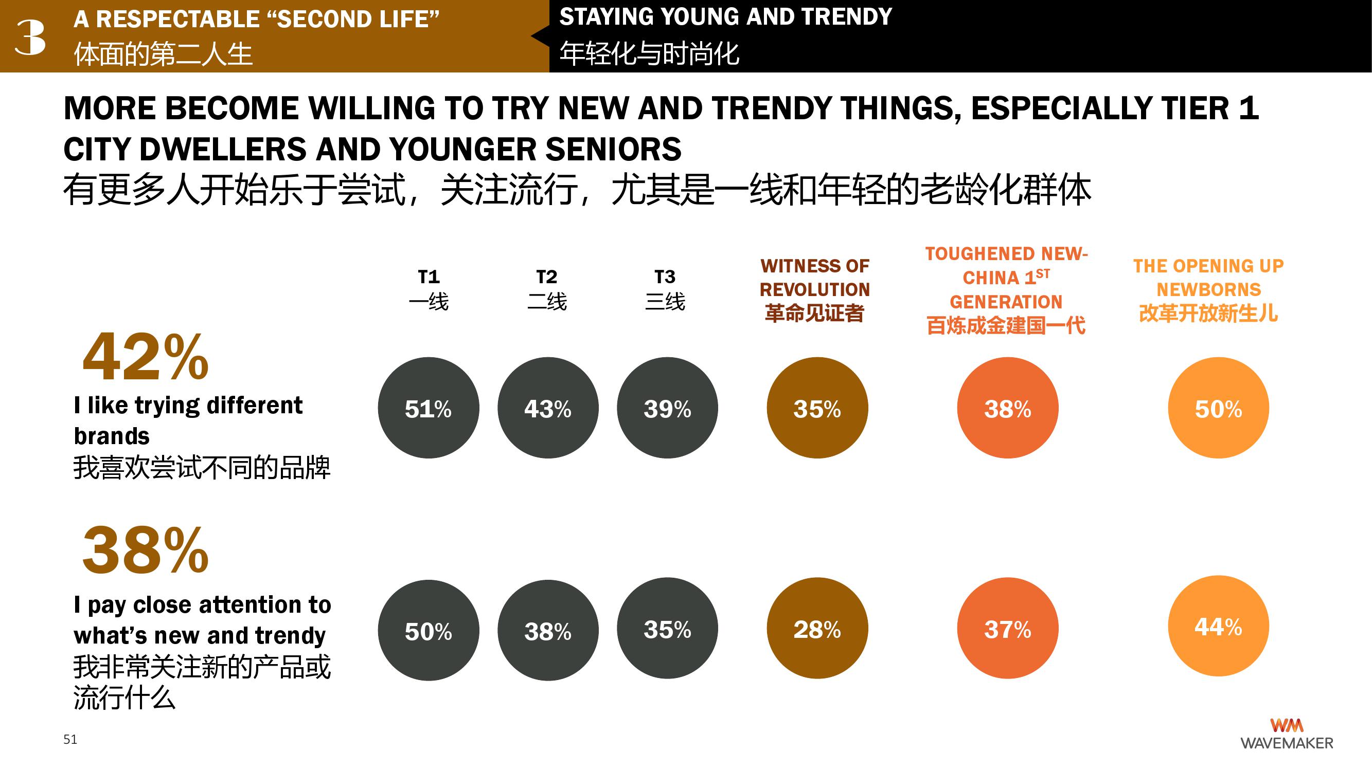 而“变老拖延症”发生在每一代人的身上,年轻化的消费态度也直接反映于他们产品的选择上。并且,他们对高端和进口产品的消费意愿在不断提升,体现了他们对愈加体面、舒适、有品质的第二人生的期待。