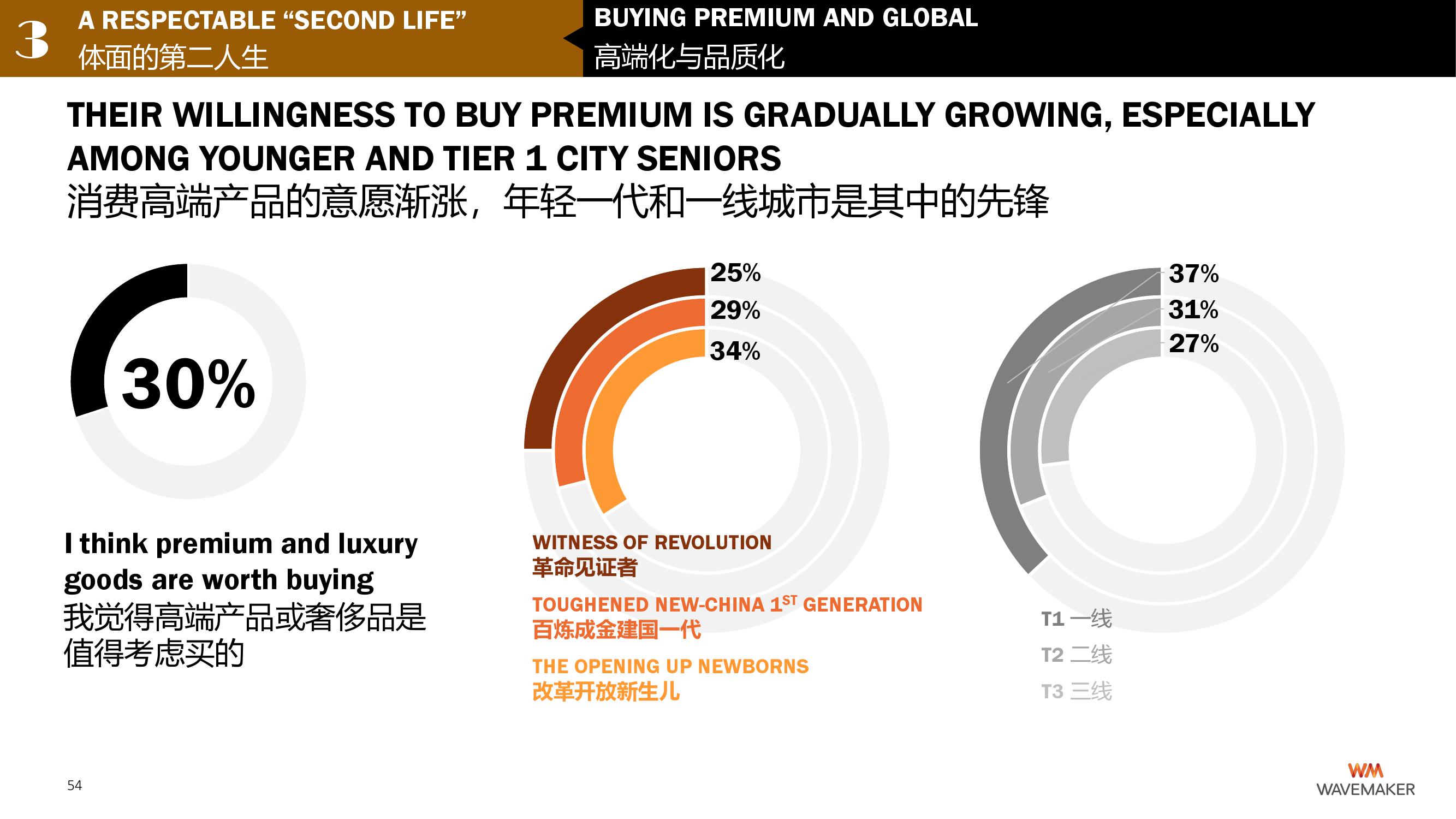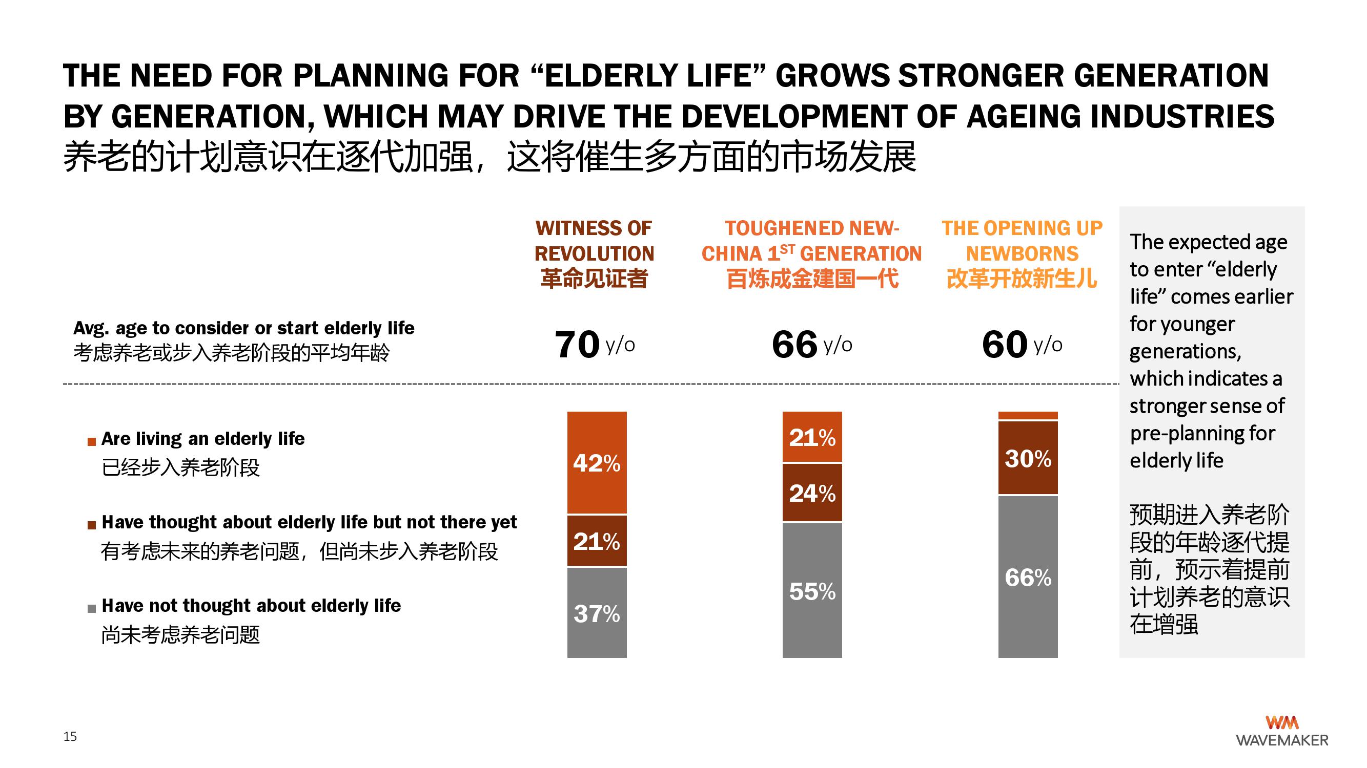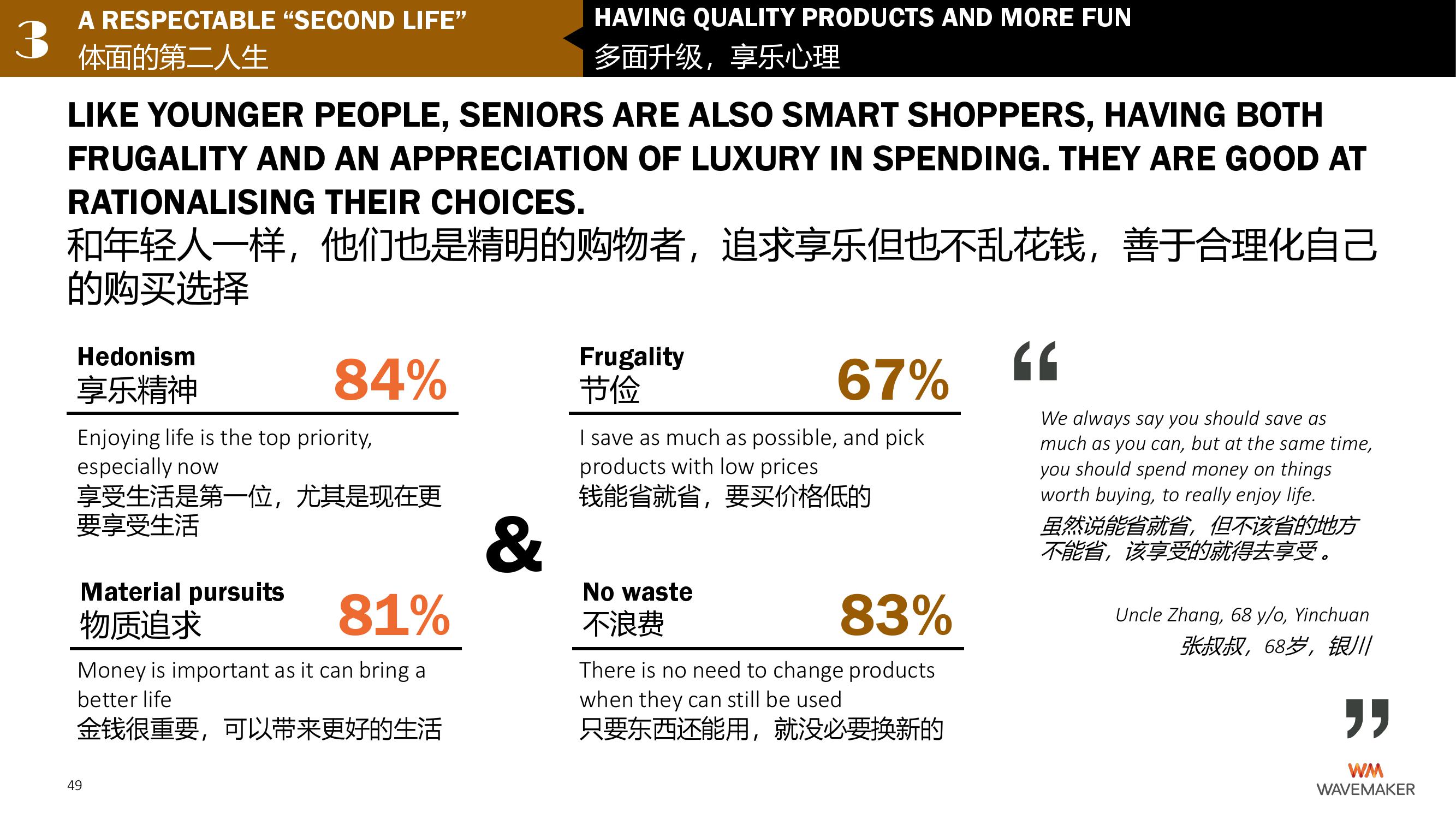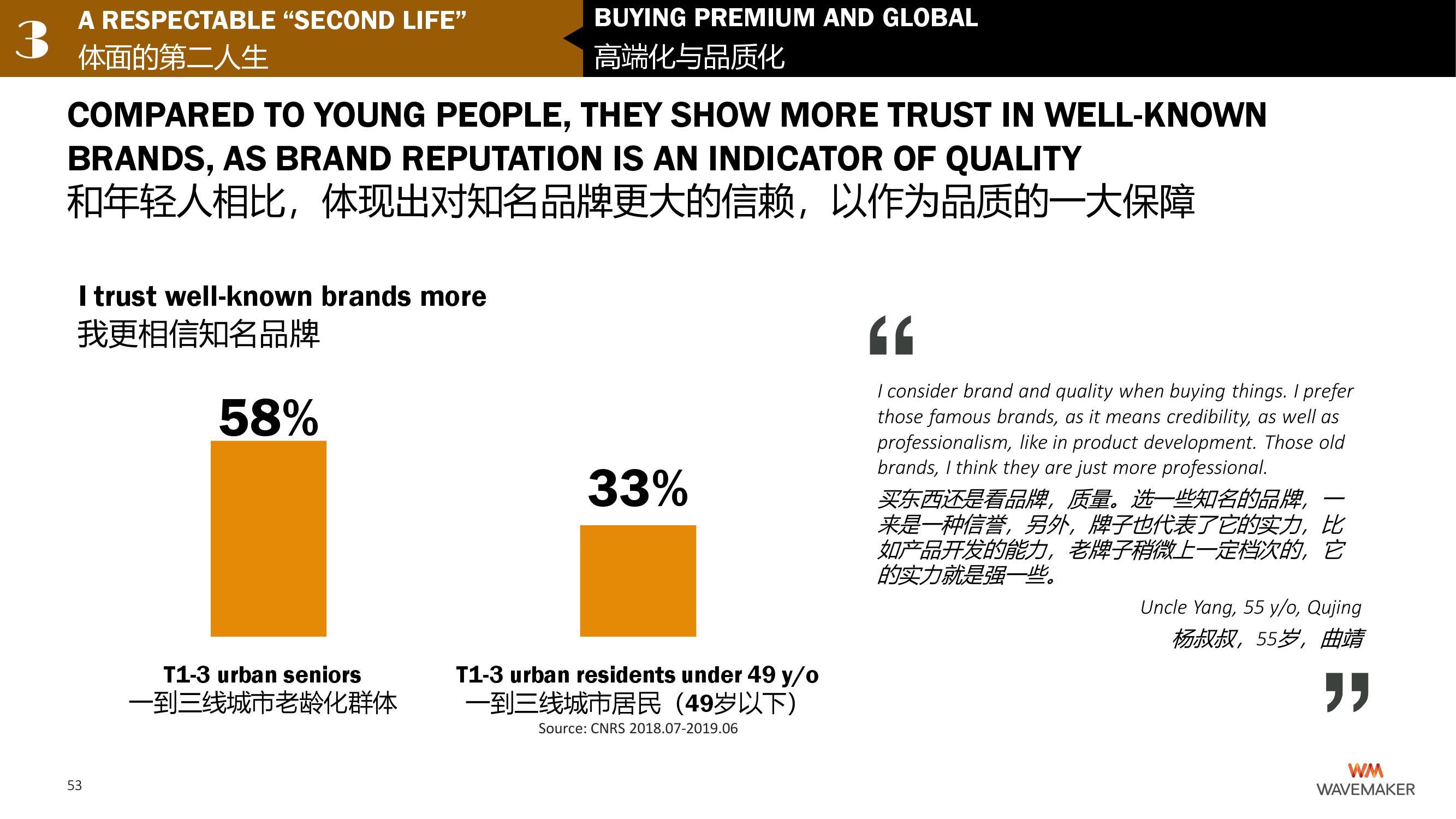而“变老拖延症”发生在每一代人的身上,年轻化的消费态度也直接反映于他们产品的选择上。并且,他们对高端和进口产品的消费意愿在不断提升,体现了他们对愈加体面、舒适、有品质的第二人生的期待。