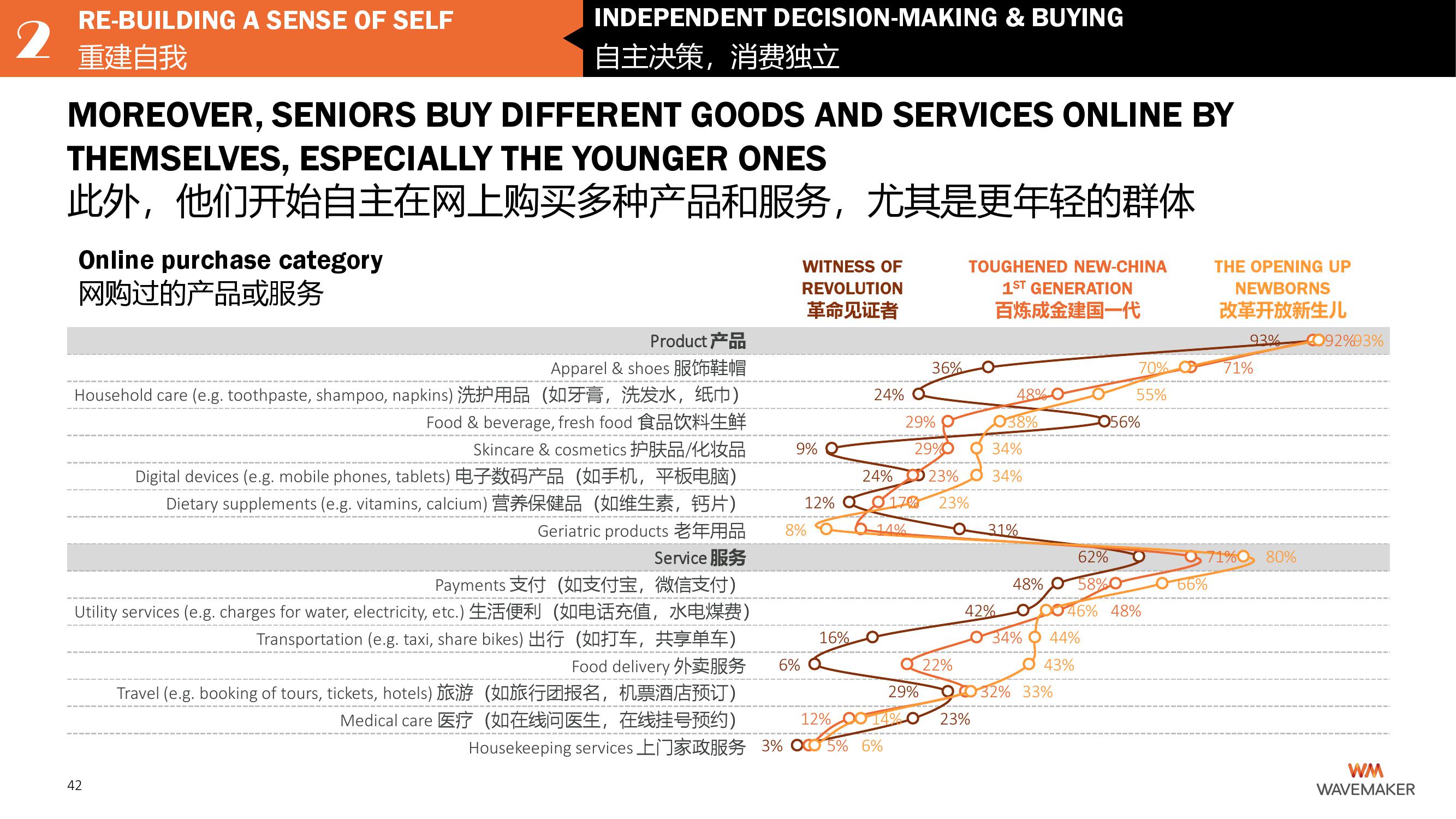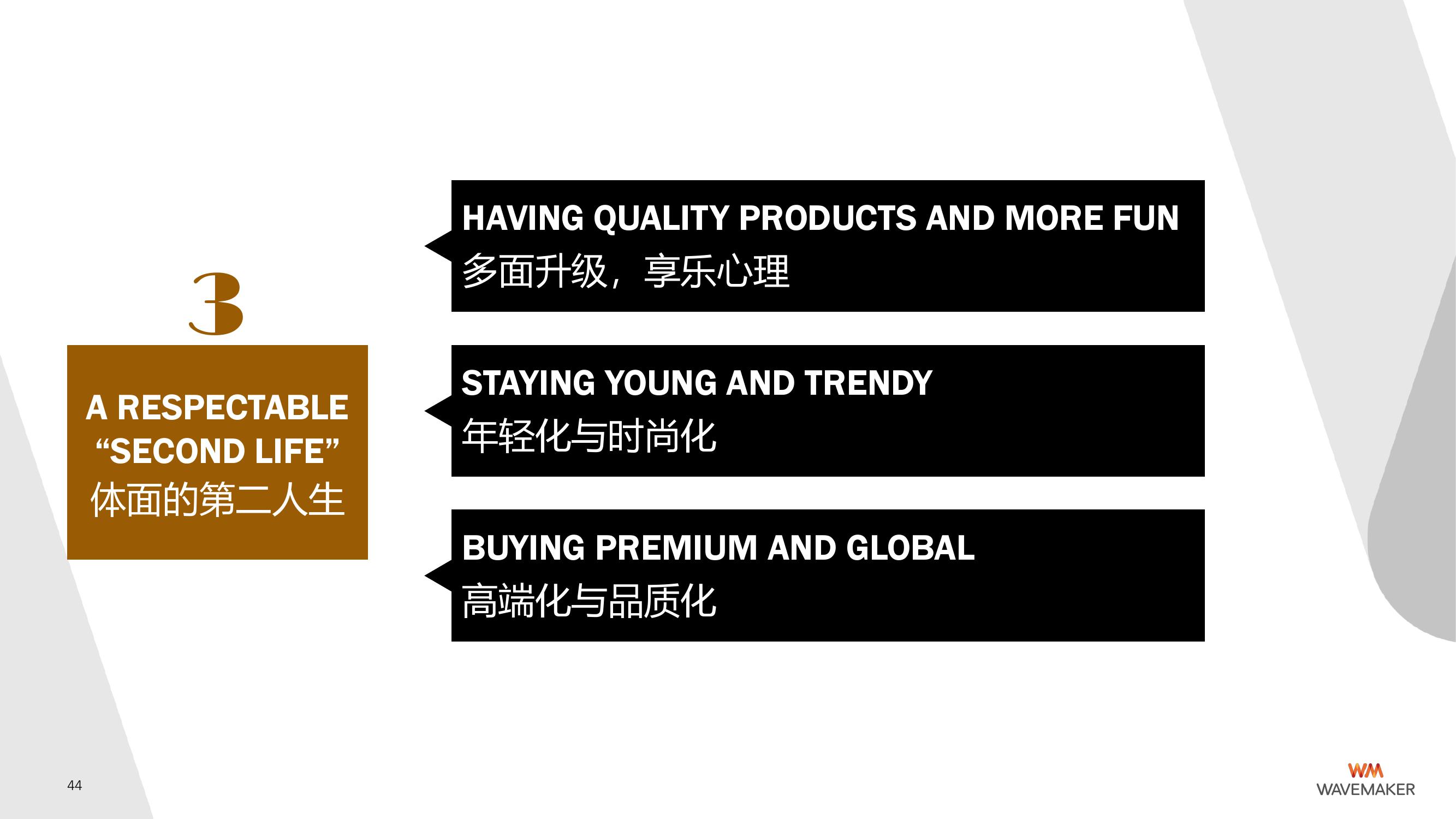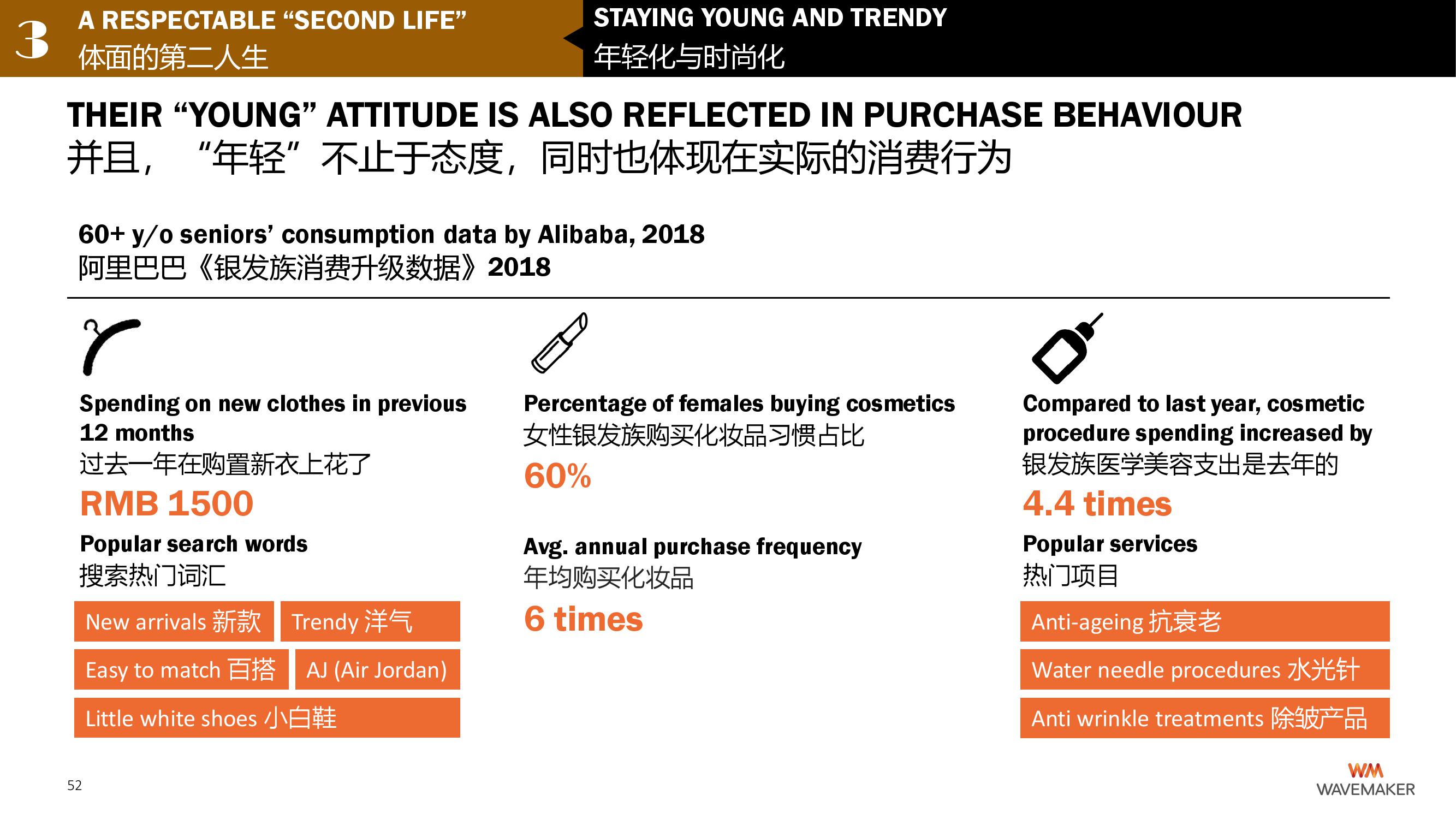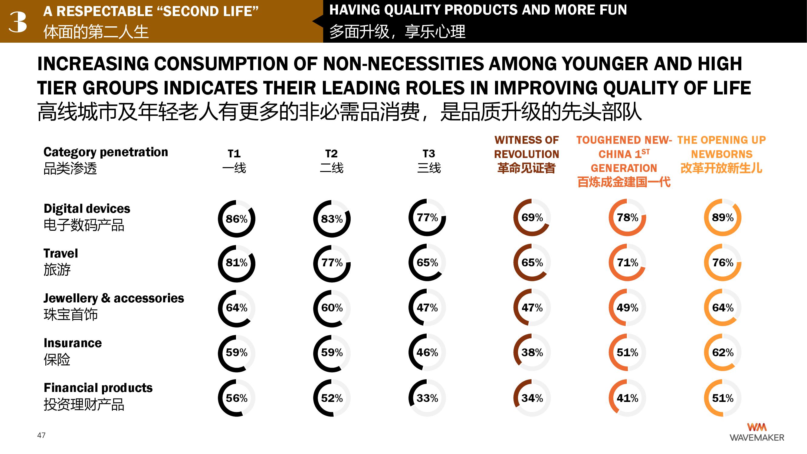 而“变老拖延症”发生在每一代人的身上,年轻化的消费态度也直接反映于他们产品的选择上。并且,他们对高端和进口产品的消费意愿在不断提升,体现了他们对愈加体面、舒适、有品质的第二人生的期待。