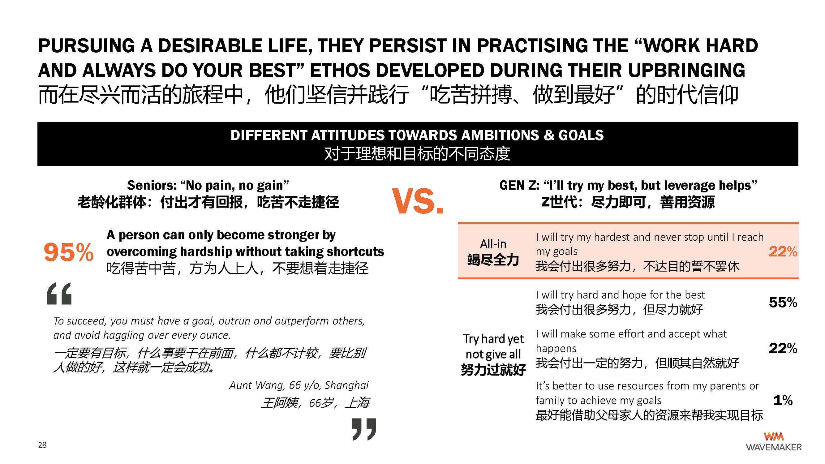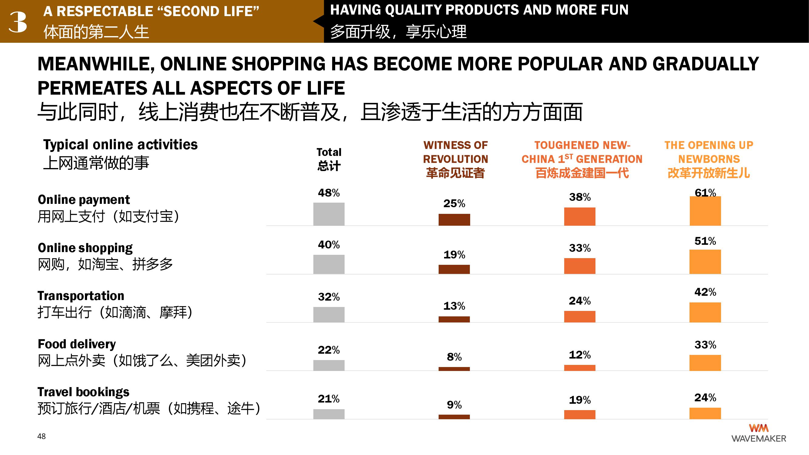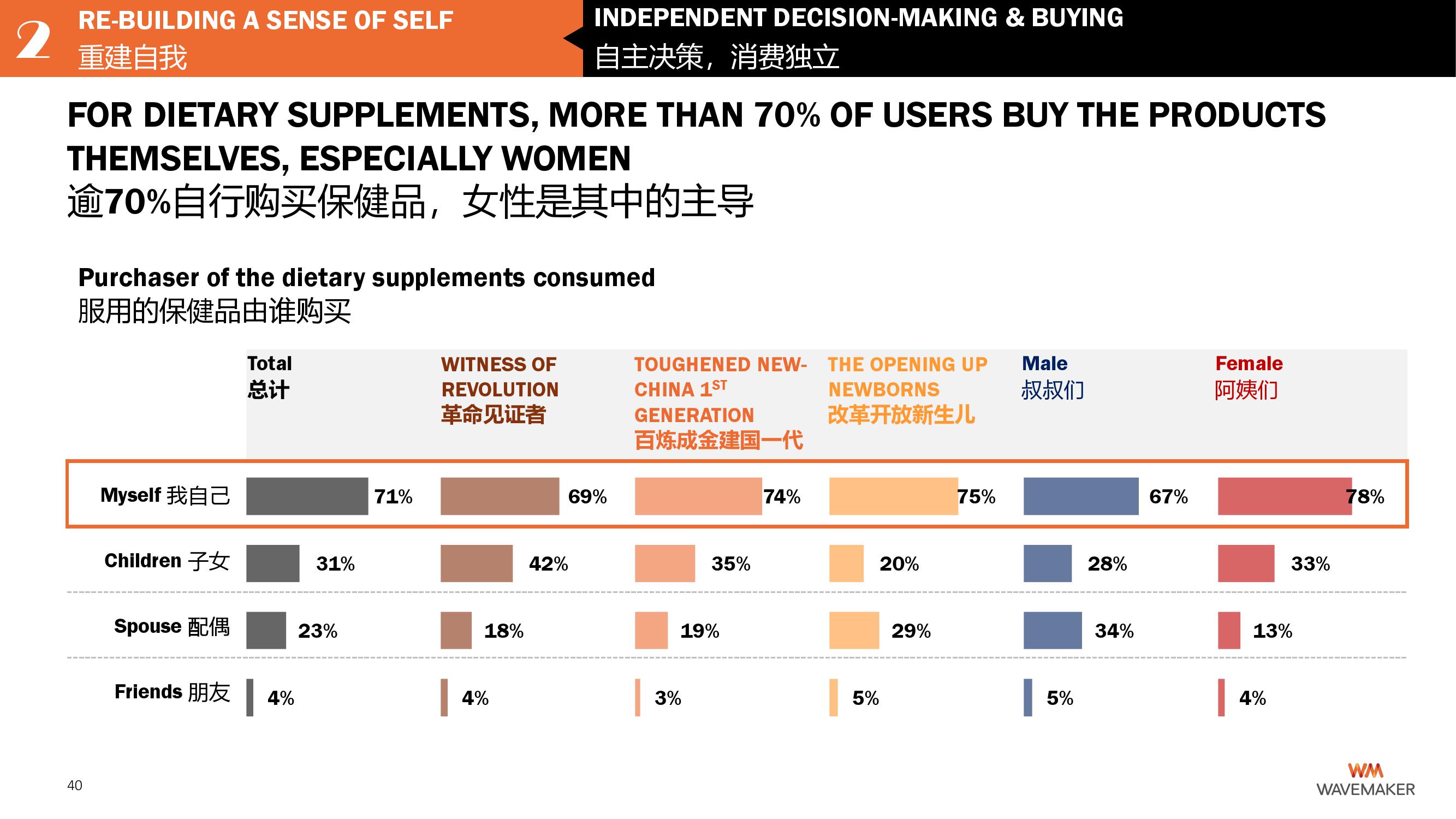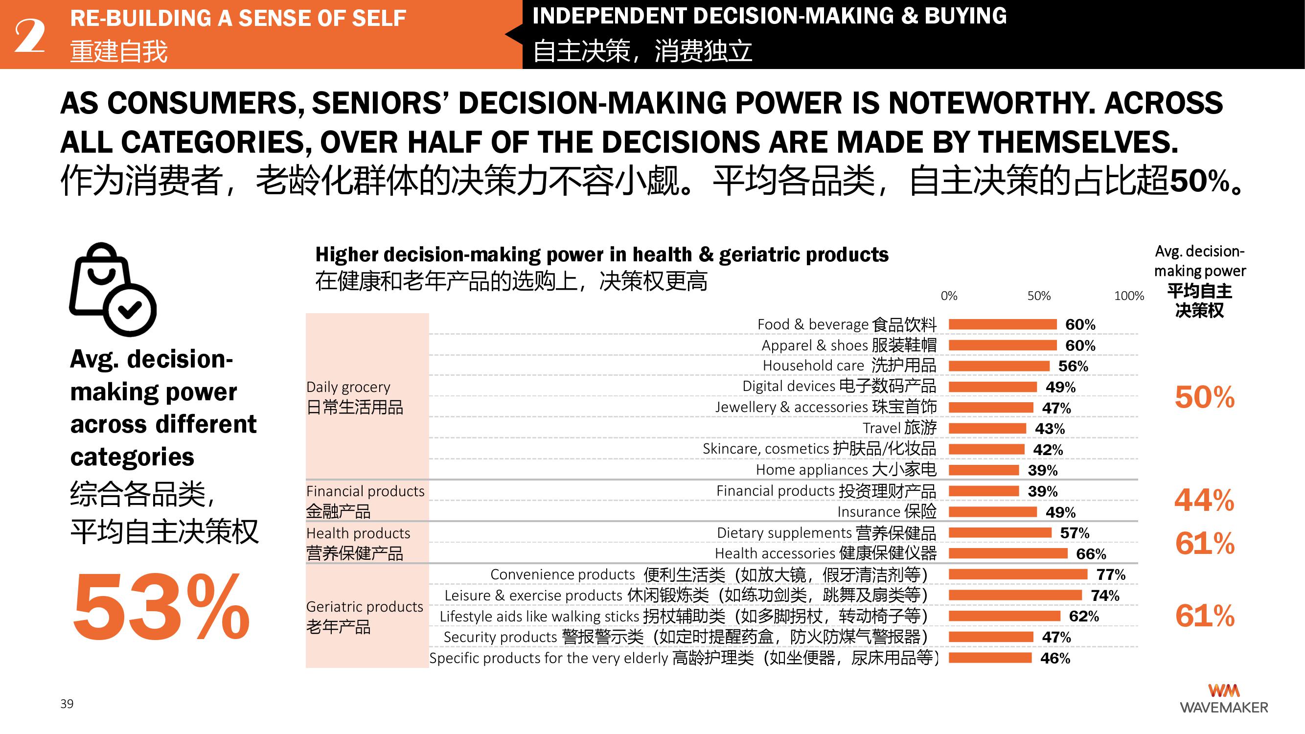 而“变老拖延症”发生在每一代人的身上,年轻化的消费态度也直接反映于他们产品的选择上。并且,他们对高端和进口产品的消费意愿在不断提升,体现了他们对愈加体面、舒适、有品质的第二人生的期待。