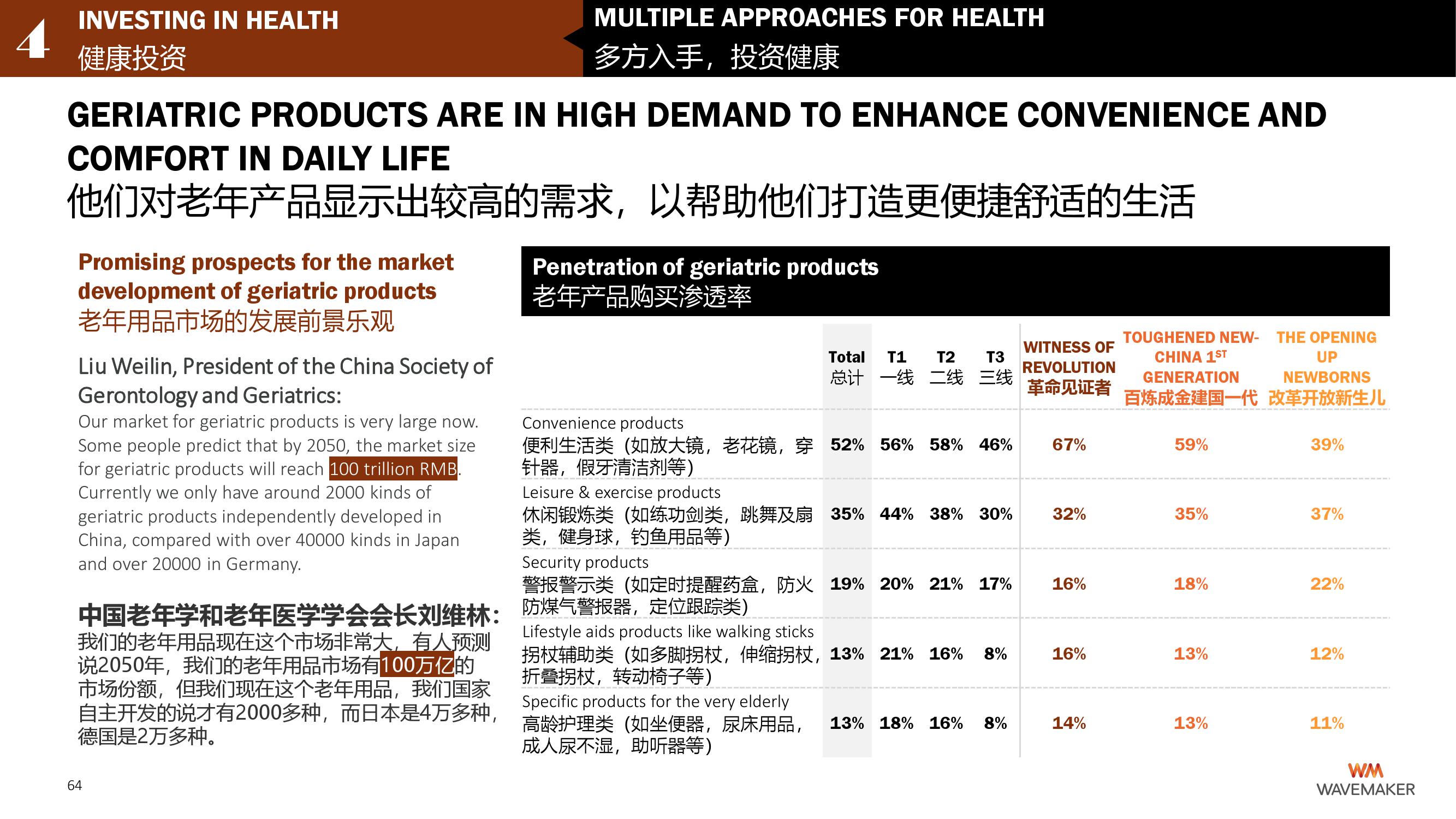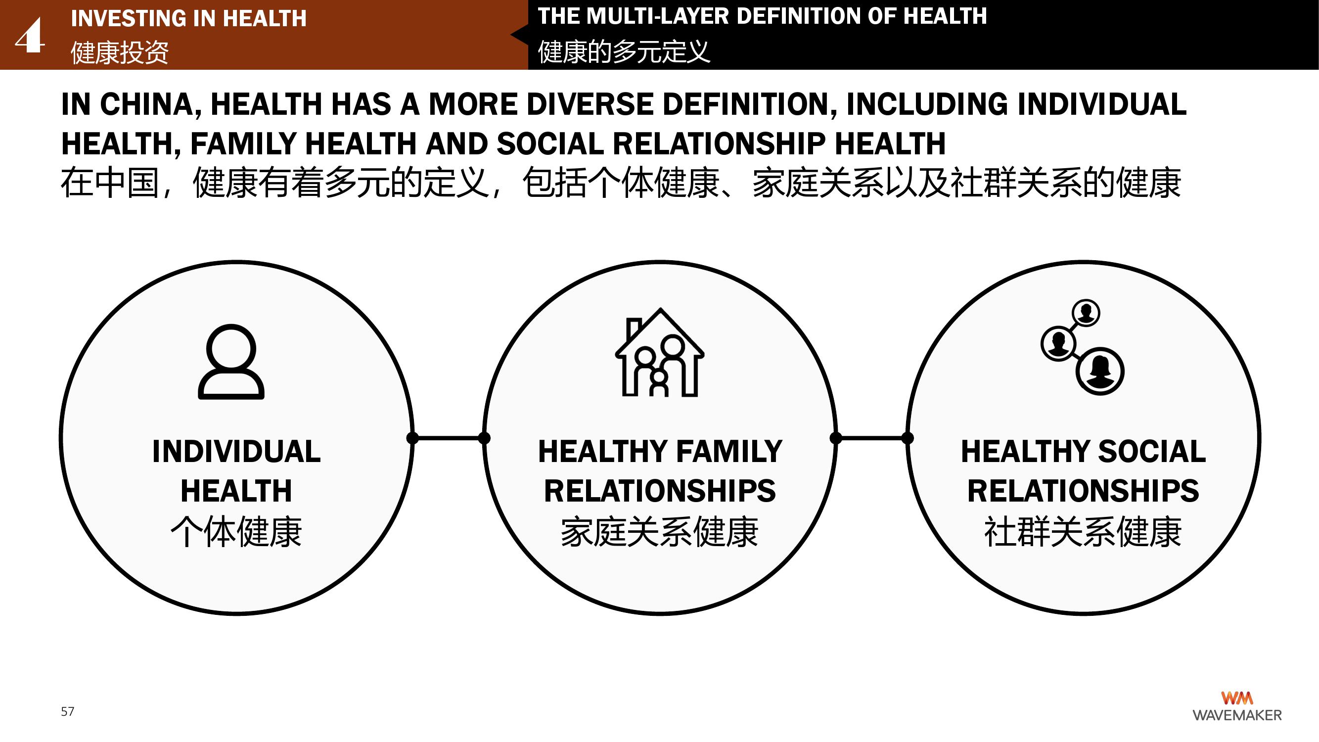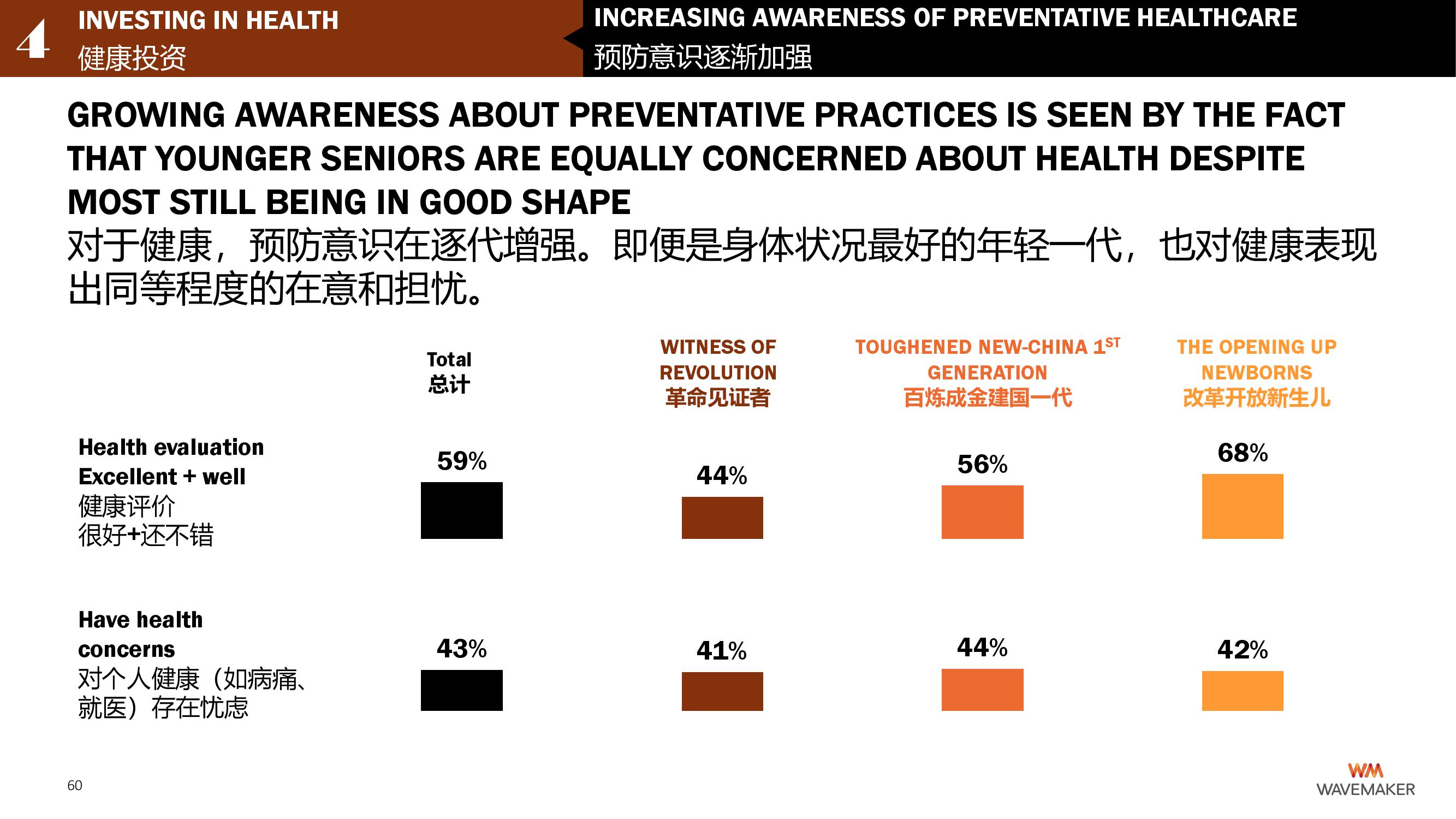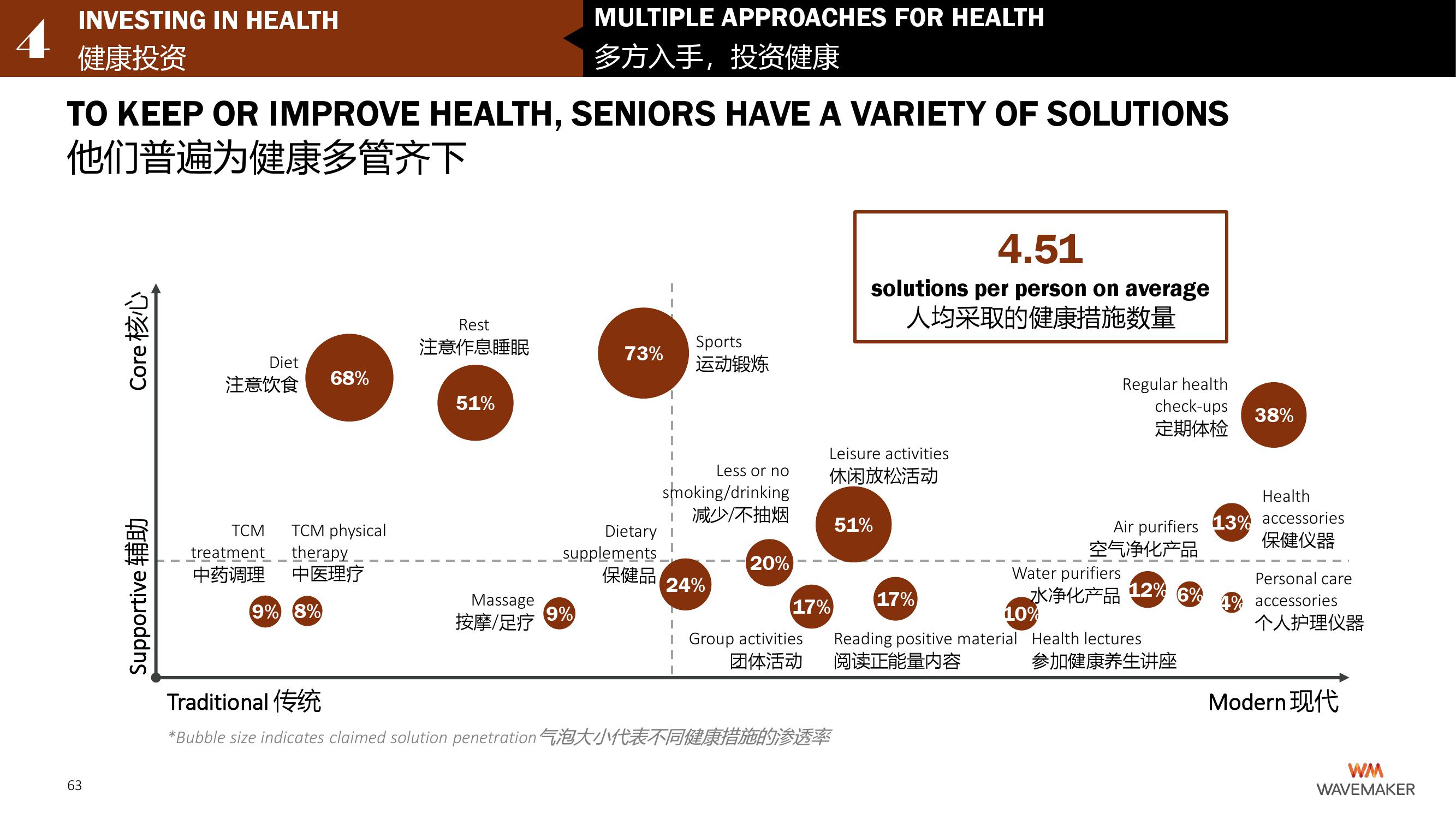 健康在中国具有多元的定义,除了个体健康之外,还包括良好的家庭关系和社群关系。老龄化群体不仅在个体健康层面展现出逐代增强的预防意识,他们更为打造综合健康多管齐下,积极使用各类健康产品和老年用品,并热切投身于丰富多样的集体文娱活动,打造生活方式的健康。