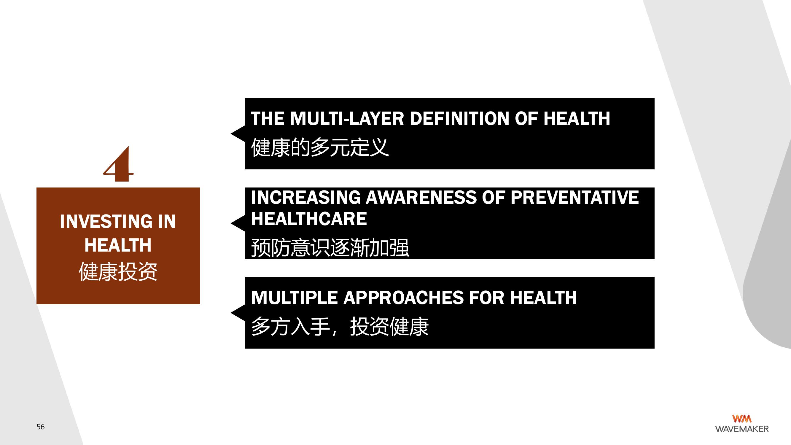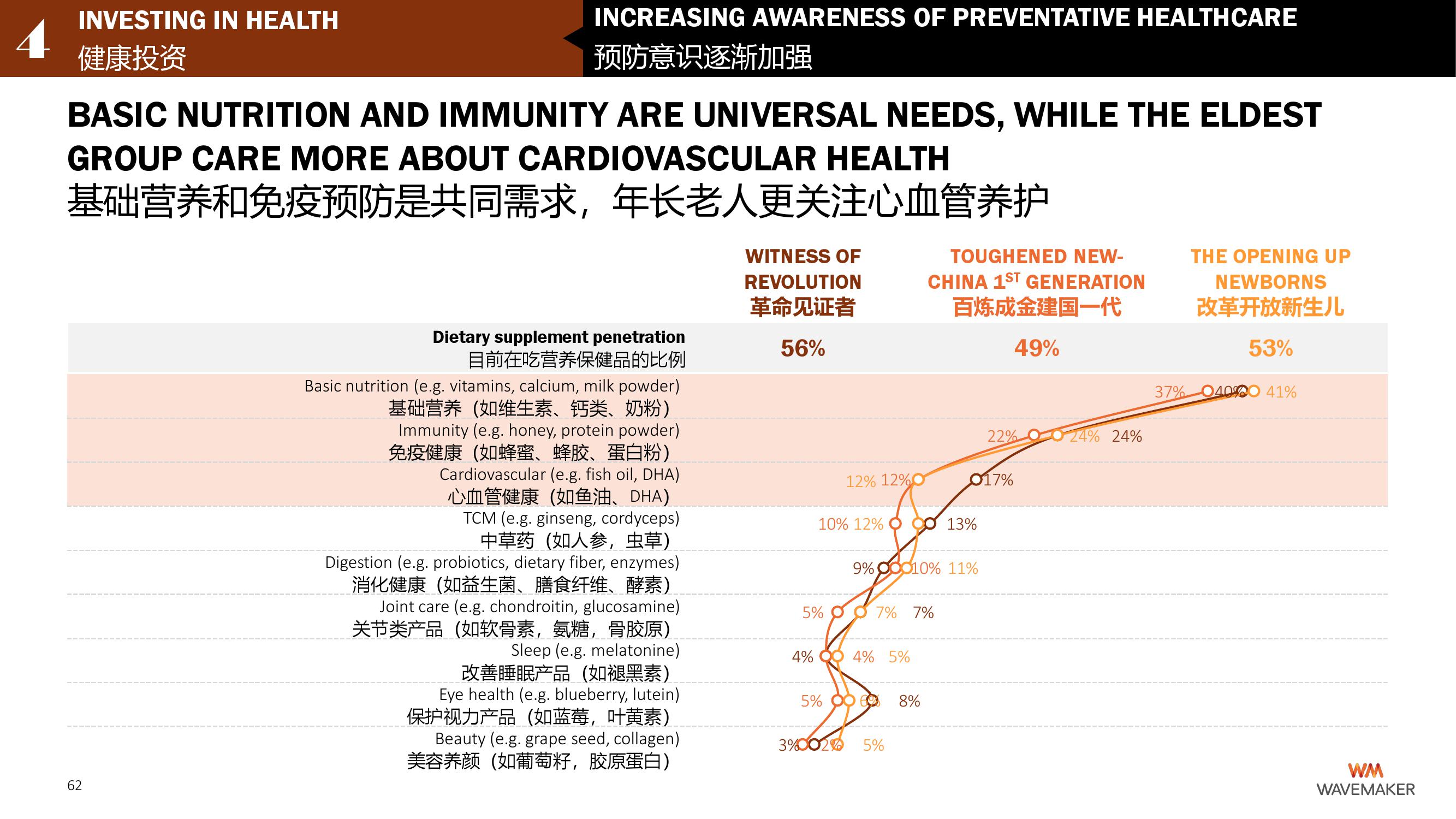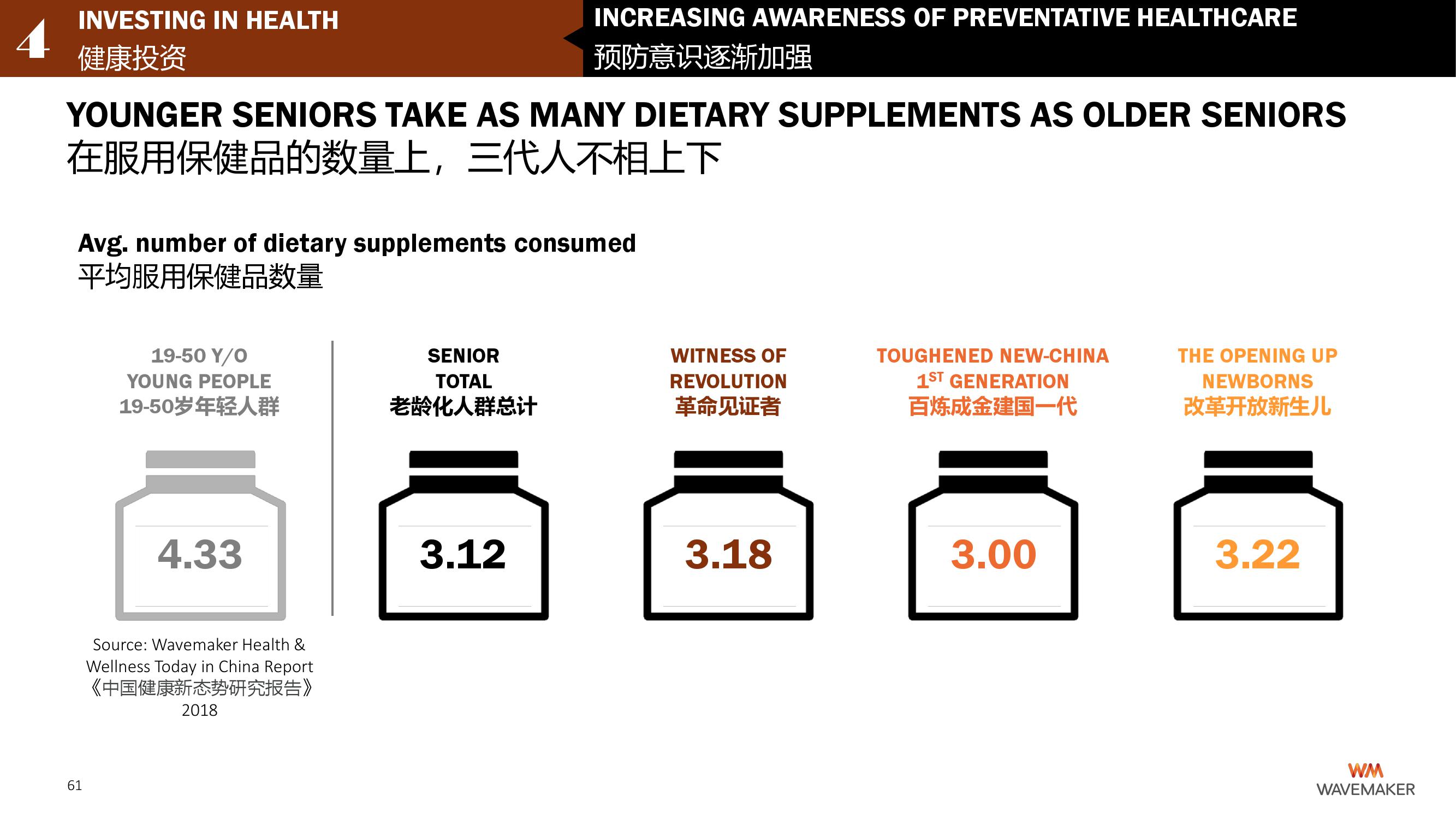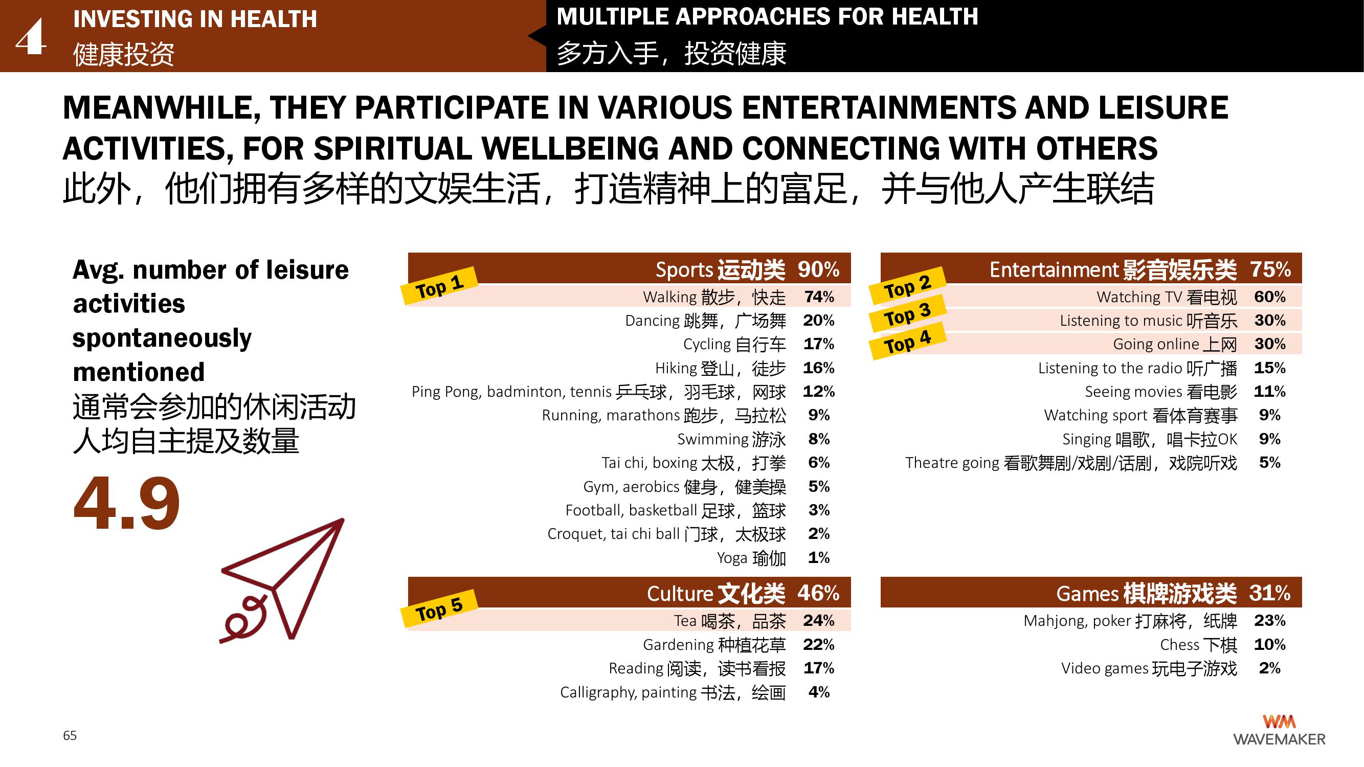 健康在中国具有多元的定义,除了个体健康之外,还包括良好的家庭关系和社群关系。老龄化群体不仅在个体健康层面展现出逐代增强的预防意识,他们更为打造综合健康多管齐下,积极使用各类健康产品和老年用品,并热切投身于丰富多样的集体文娱活动,打造生活方式的健康。