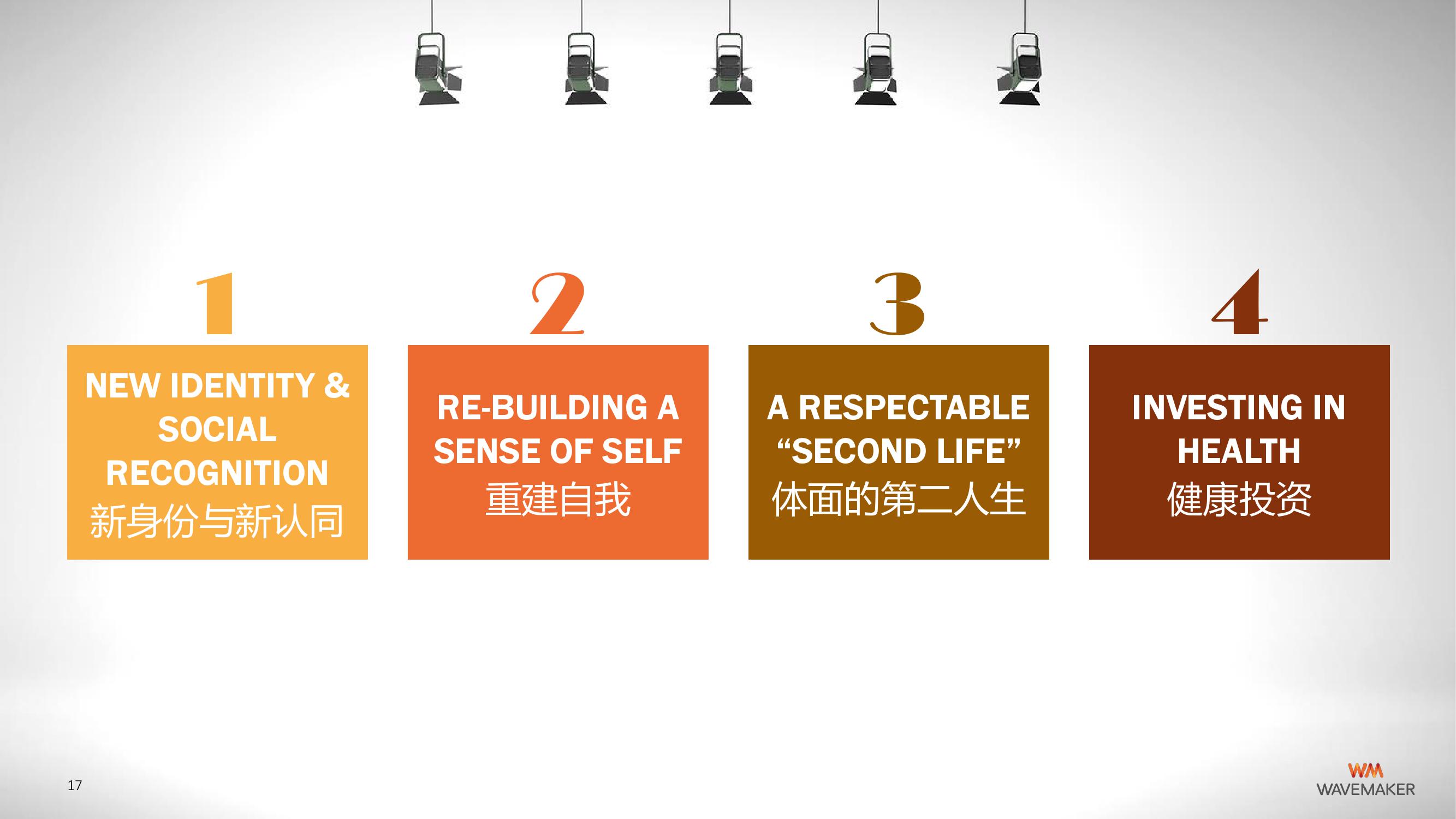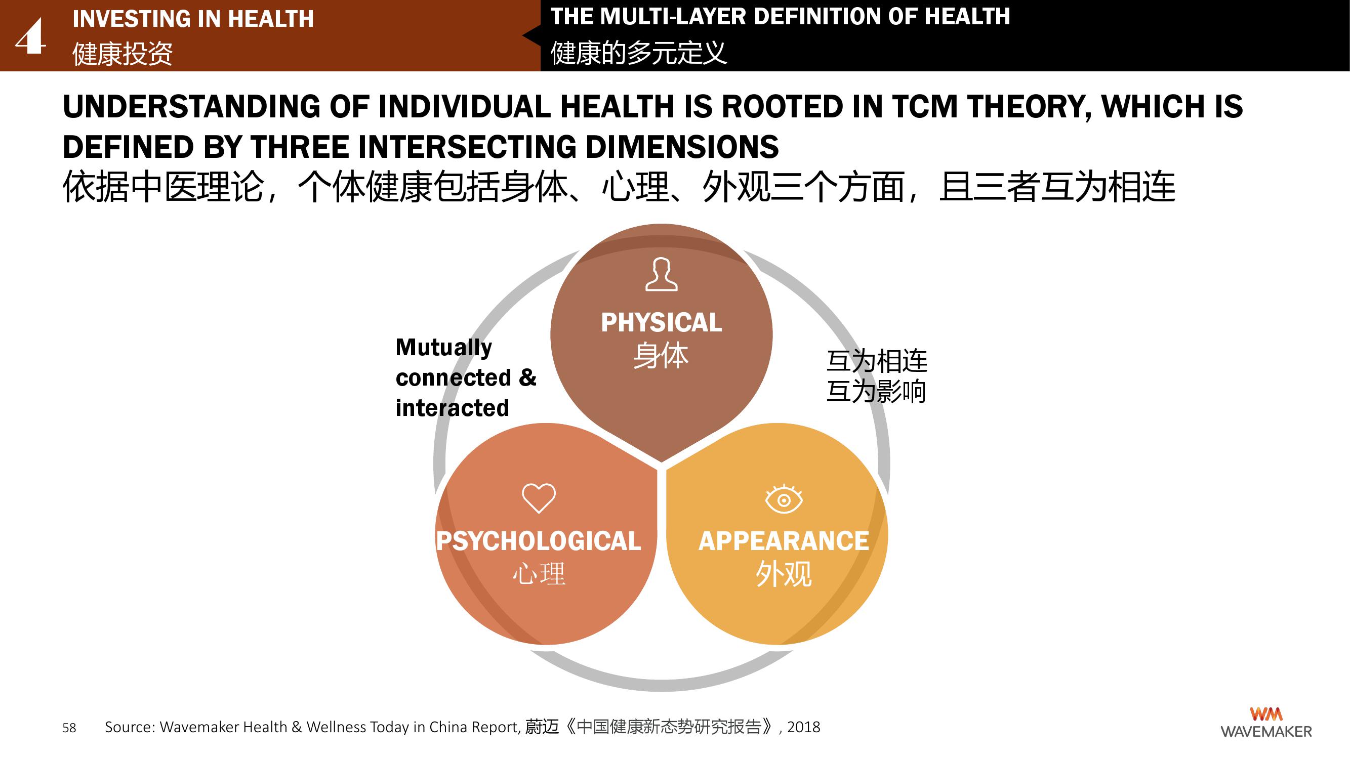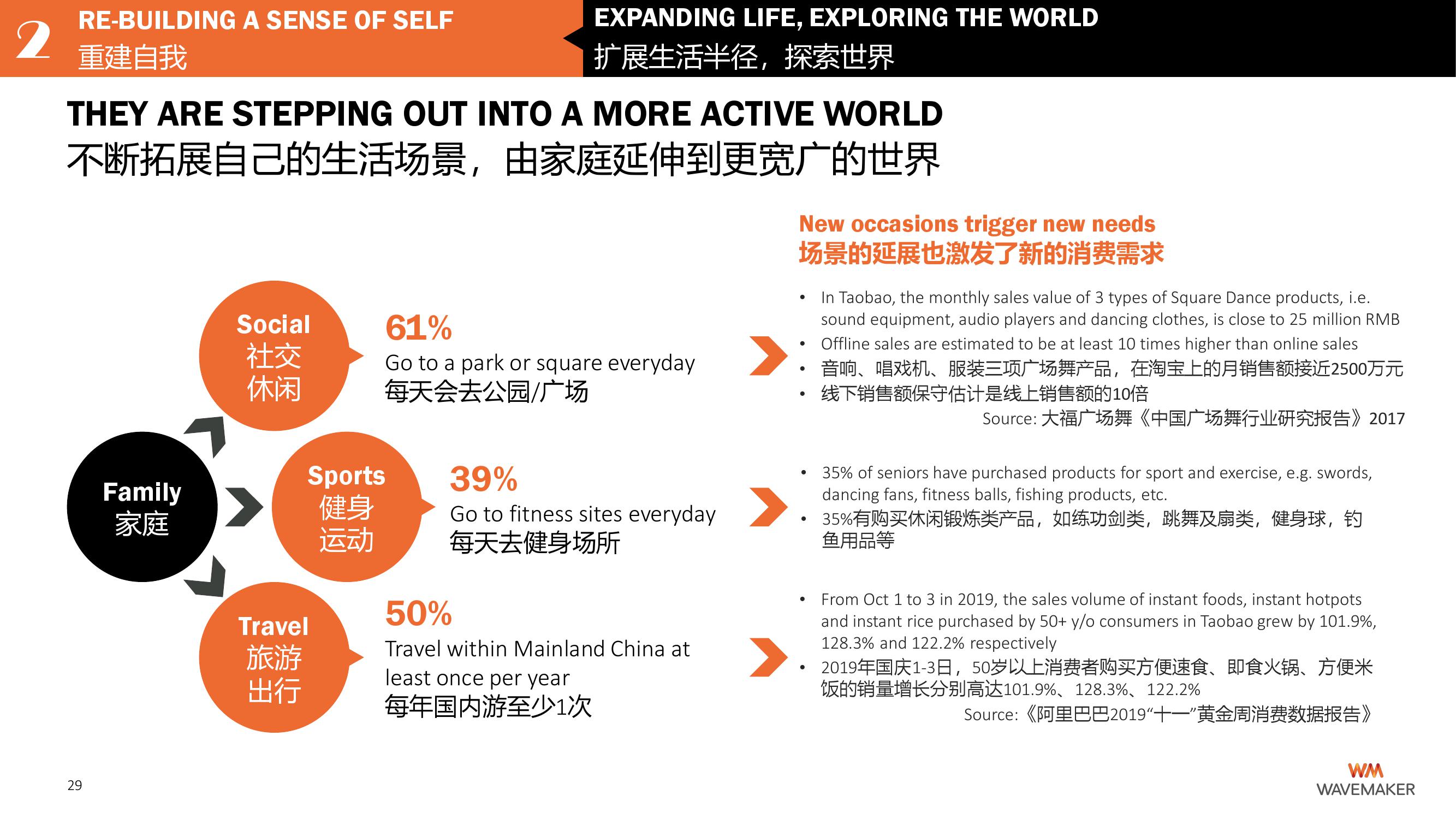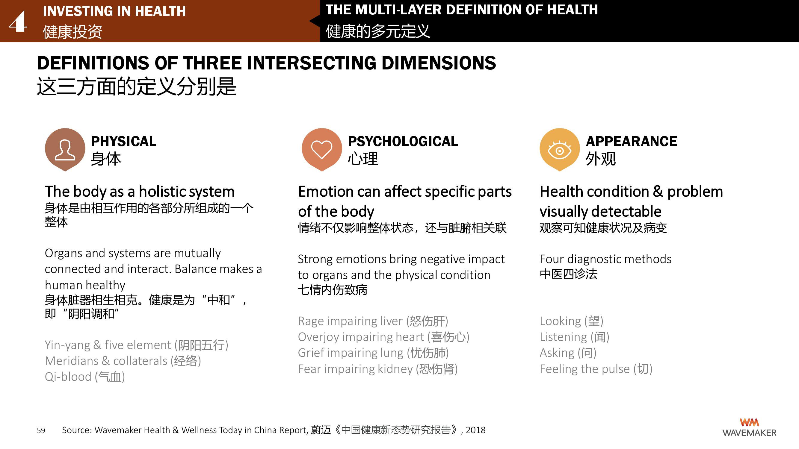 健康在中国具有多元的定义,除了个体健康之外,还包括良好的家庭关系和社群关系。老龄化群体不仅在个体健康层面展现出逐代增强的预防意识,他们更为打造综合健康多管齐下,积极使用各类健康产品和老年用品,并热切投身于丰富多样的集体文娱活动,打造生活方式的健康。