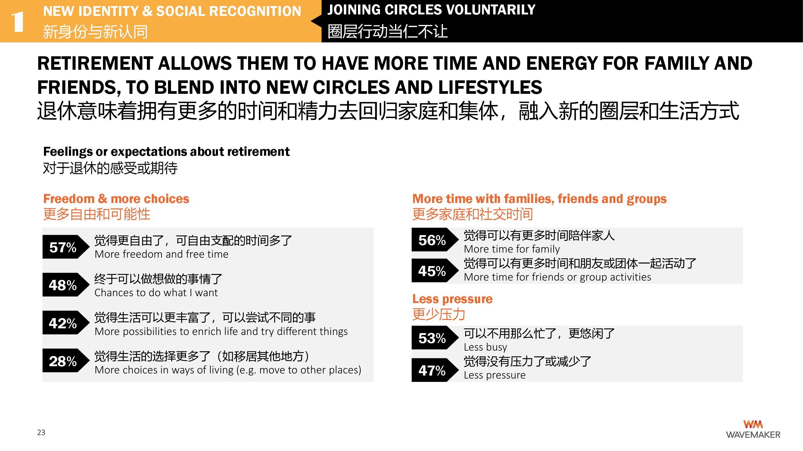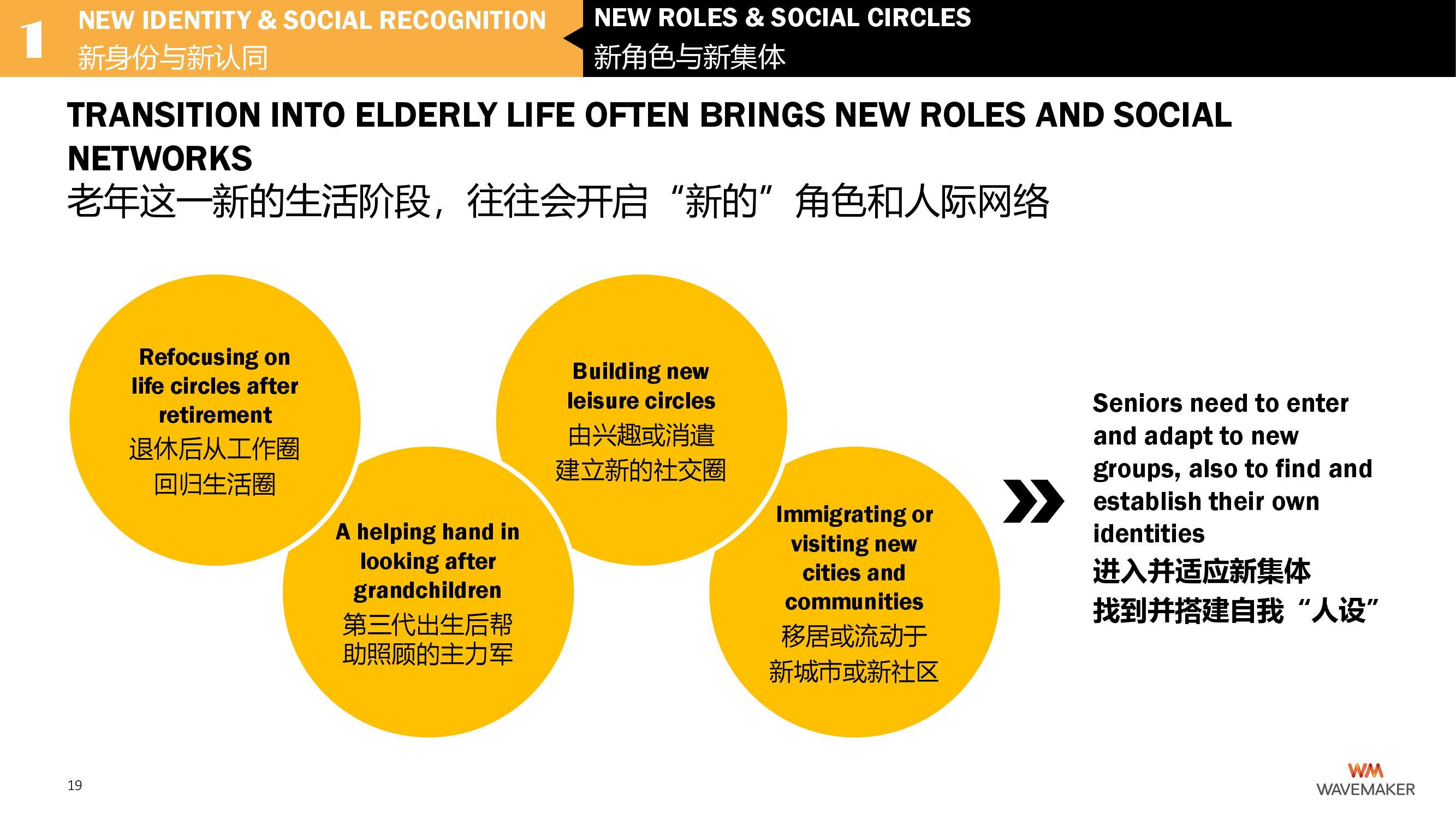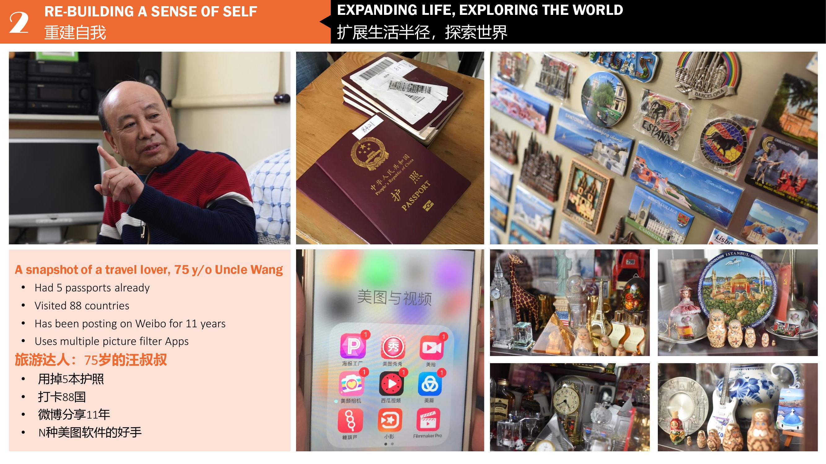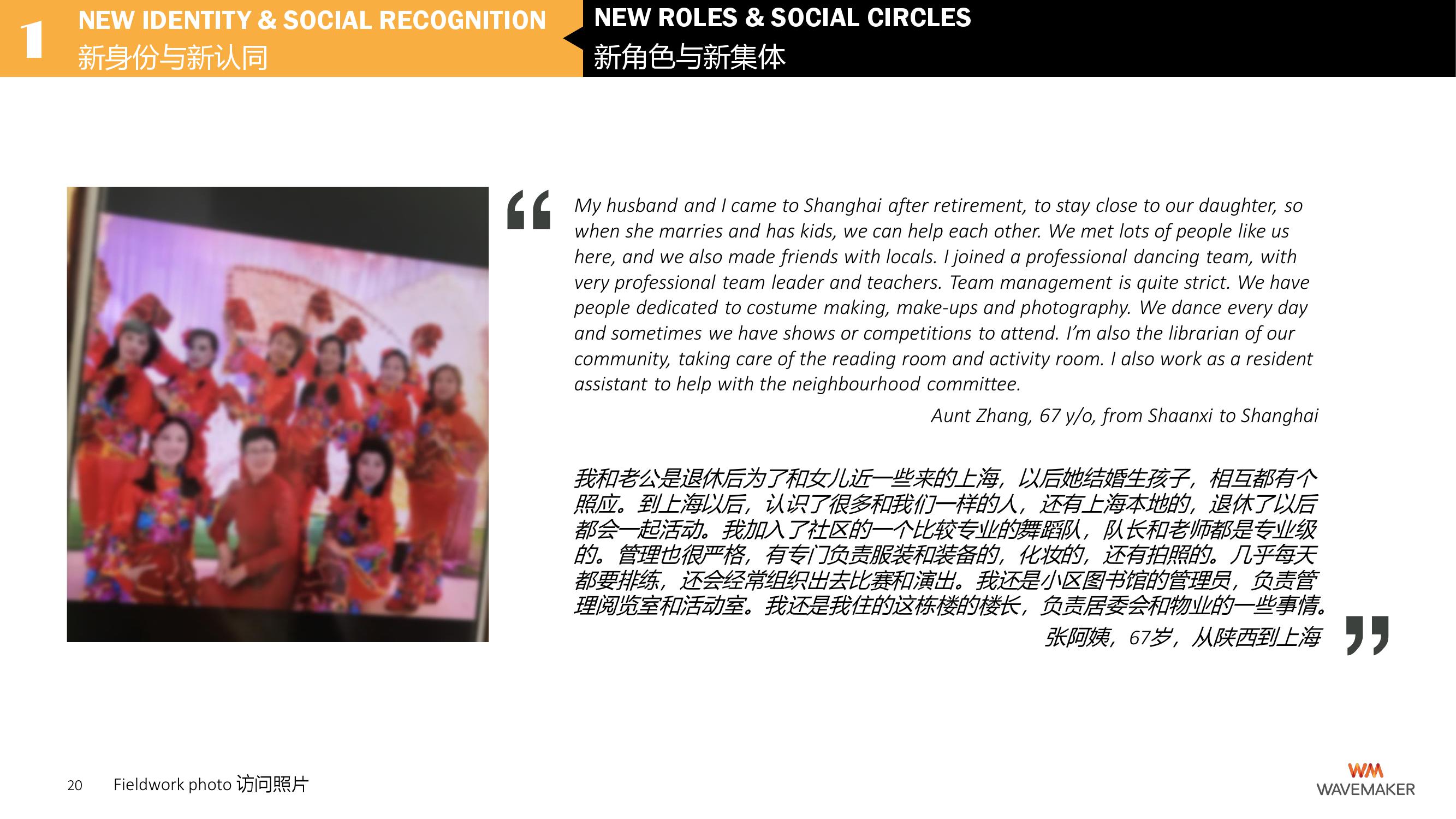 无论是退休后从工作圈回归生活圈、建立兴趣驱动的社交圈、还是移居或流动于新的城市或社区,老年生活往往会开启“新”的角色和人际网络。成长于集体为先的社会环境,他们寻求集体的归属感和认同感,表现出增长的社交需求,热衷于抱团行动。