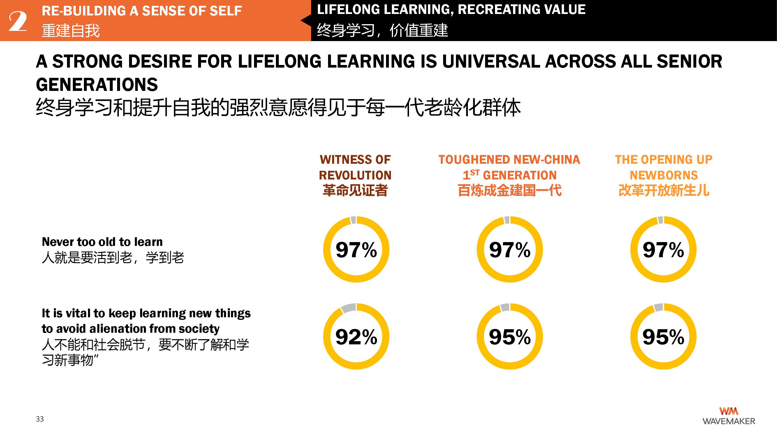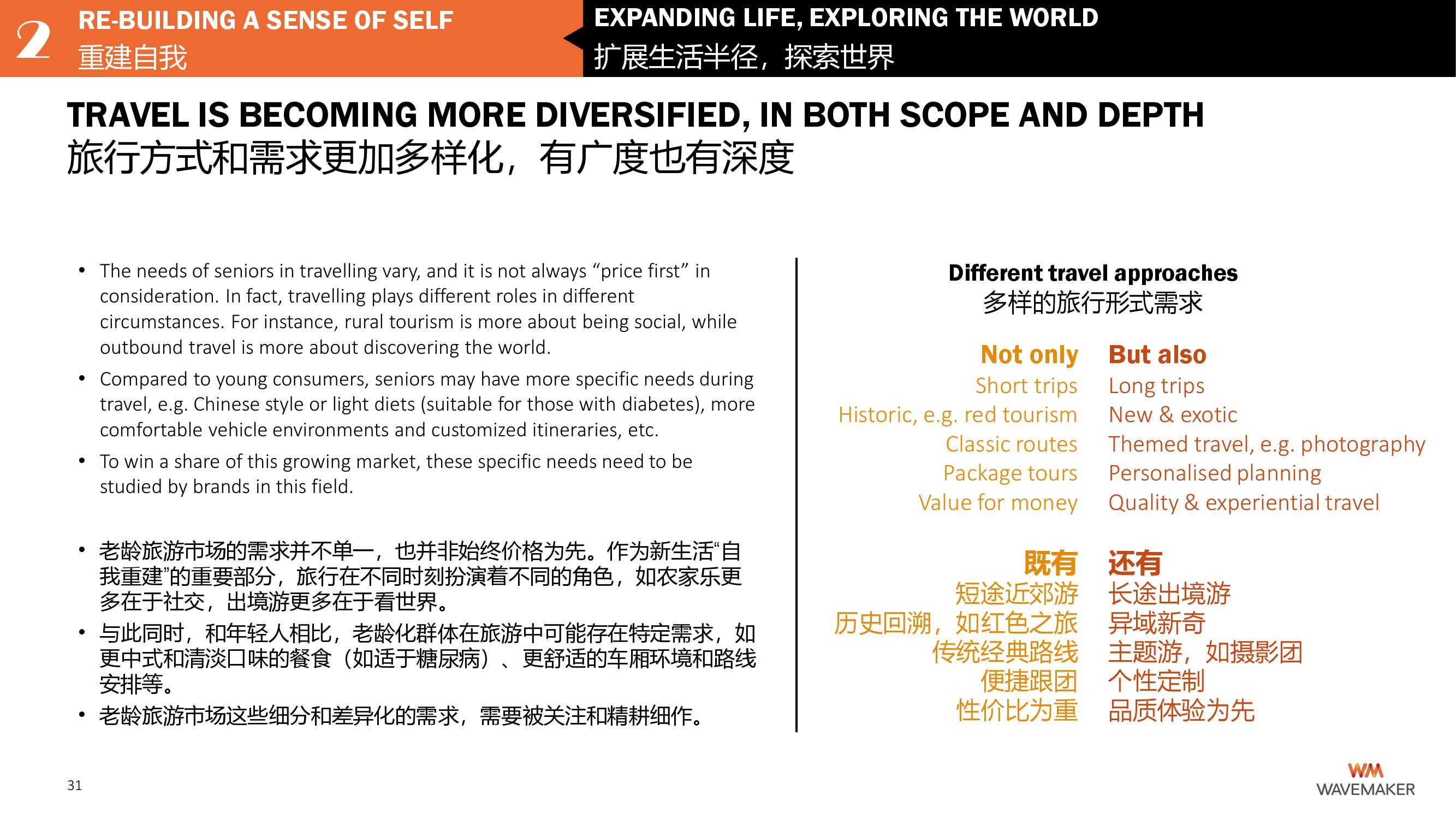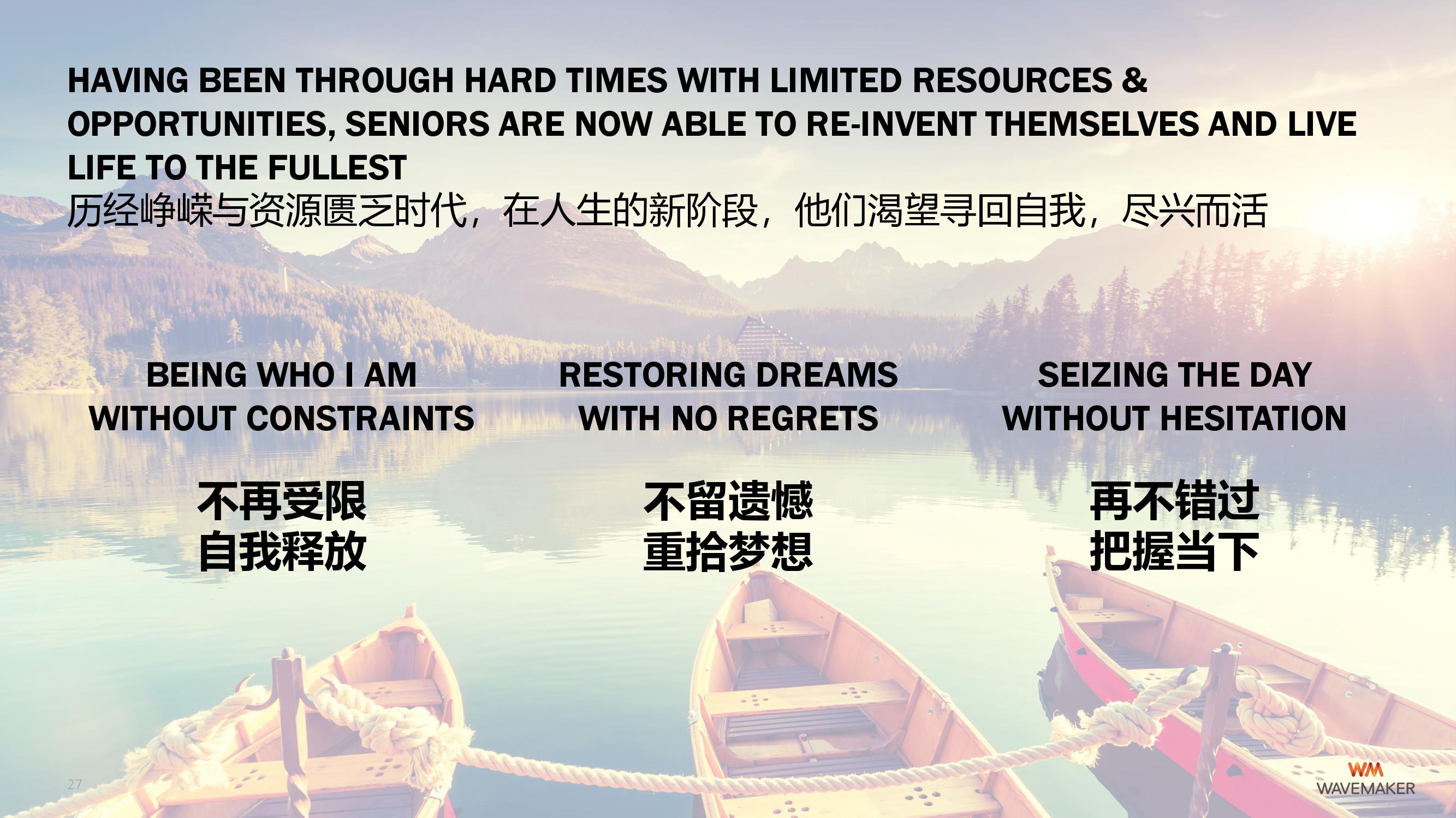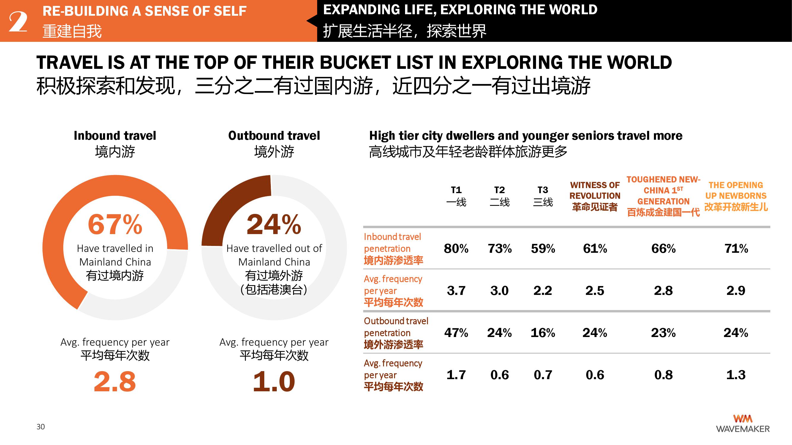 历经峥嵘也或曾遗憾,在人生的新阶段,他们开始寻回自我,尽兴而活。他们本着不再受限、不留遗憾、再不错过的心态,渴望自我释放、重拾梦想、把握当下。他们的生活场景由家庭向外界延伸,更多的社交、休闲、运动、旅行、自我学习和精进等,也带动着不同品类的增长。比如,旅行的方式和需求更加多样化,有广度也有深度。他们终身学习和提升自我的强烈意愿得见于每一个代际,退休后的价值创造更是关注的重点。
