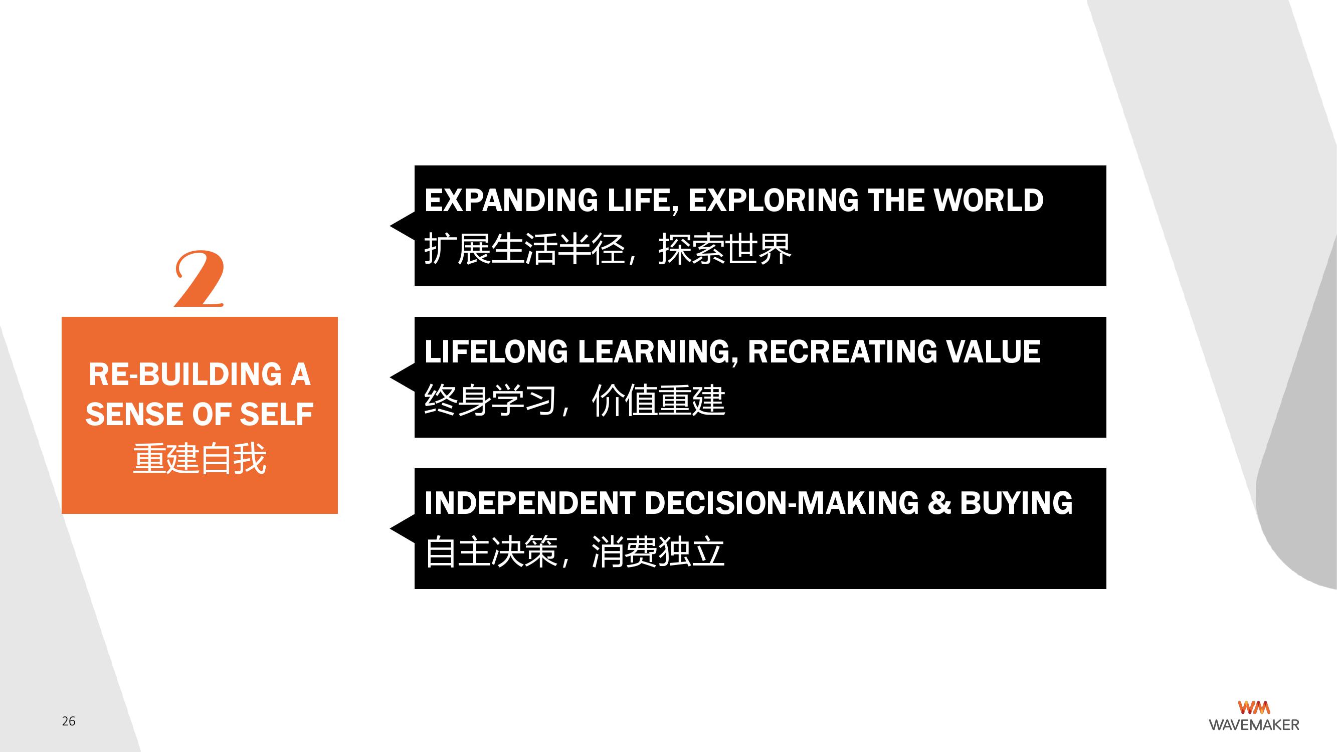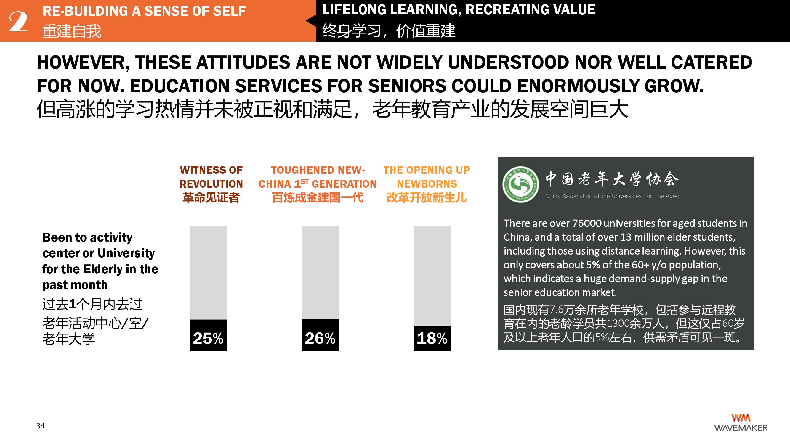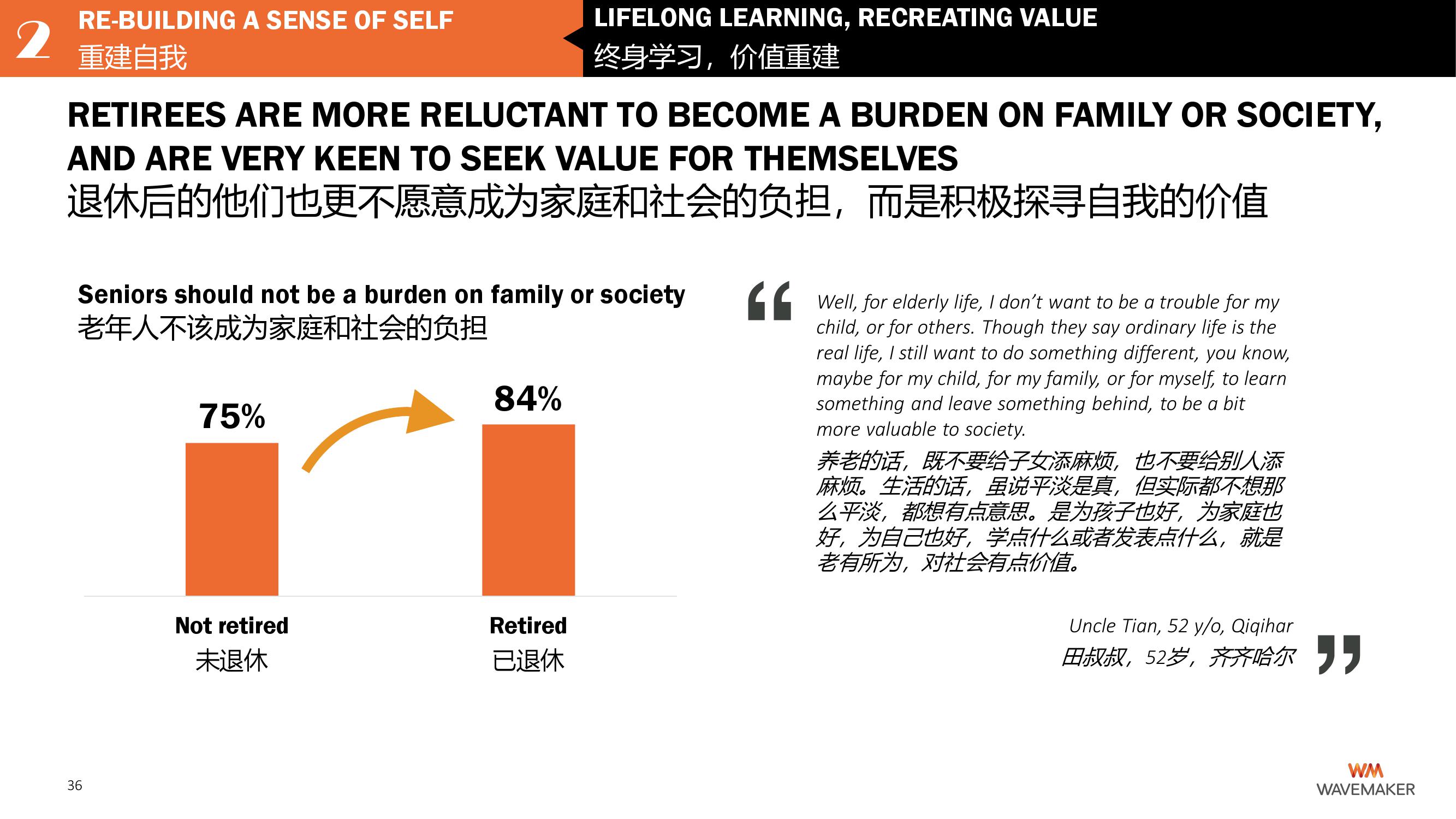 历经峥嵘也或曾遗憾,在人生的新阶段,他们开始寻回自我,尽兴而活。他们本着不再受限、不留遗憾、再不错过的心态,渴望自我释放、重拾梦想、把握当下。他们的生活场景由家庭向外界延伸,更多的社交、休闲、运动、旅行、自我学习和精进等,也带动着不同品类的增长。比如,旅行的方式和需求更加多样化,有广度也有深度。他们终身学习和提升自我的强烈意愿得见于每一个代际,退休后的价值创造更是关注的重点。