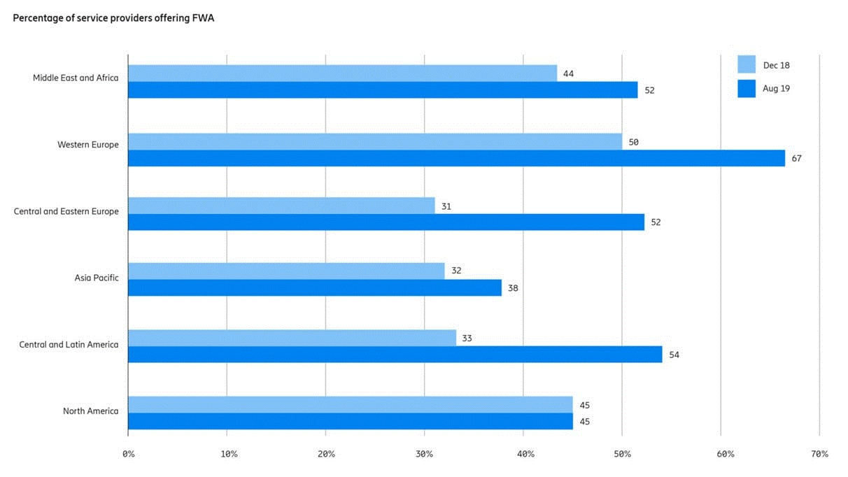FWA进一步受到服务提供商的重视。在短短6个月内,提供FWA的服务提供商数量从103家增加到140家,每2家服务提供商中就有1家拥有FWA。在西欧,2/3的服务提供商提供FWA。