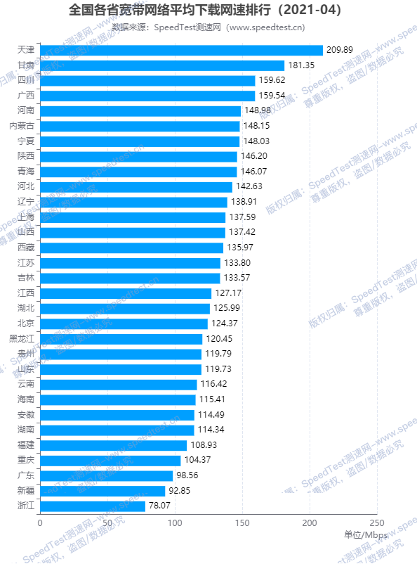 测速网:2021年4月全国4G/5G与固网宽带网速排行