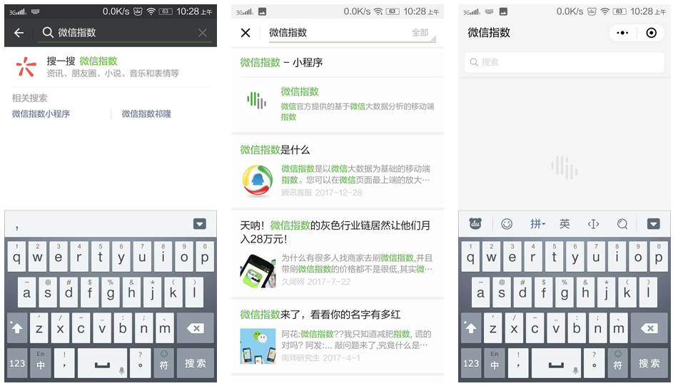 微信指数只能在微信客户端内使用,你可以用微信二维码扫一扫直接扫描上图进入,也可以在微信搜索框中输入“微信指数”,进行搜索使用。