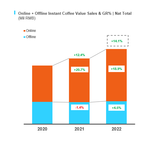 尼尔森IQ数据显示,2022年速溶咖啡全渠道销售额增长14.1%,比2021年(12.4%)全渠道销售额增速高出1.7%。2022年线上渠道虽然整体规模持续增加,但增速放缓,由21年的20.7%下降至18.9%。同时,2022年线下市场逐步回暖,22年销售额增速为4.5%,从21年的-1.4%销售额增速中逆势回升。