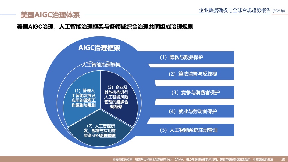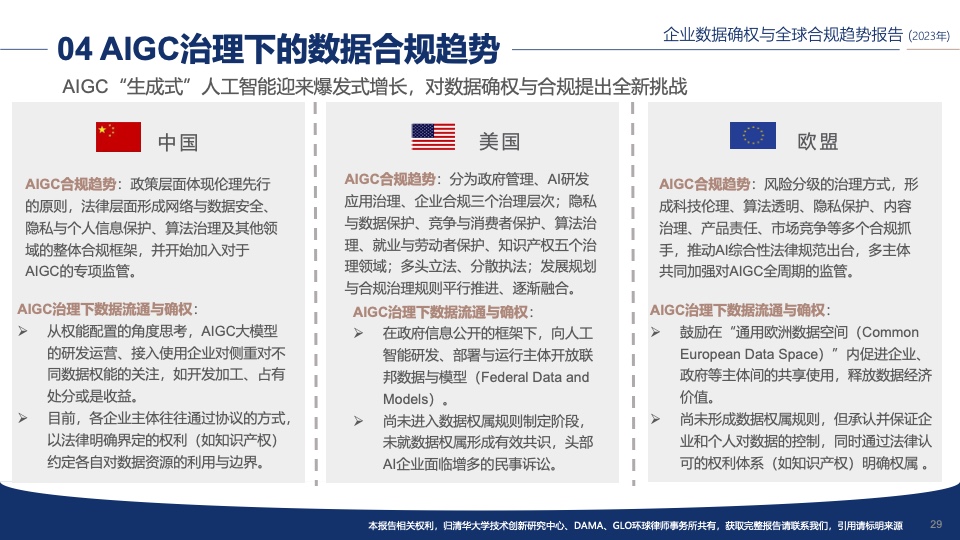 此外,报告还介绍了AIGC治理下的数据合规趋势:2023年AIGC“生成式”人工智能迎来爆发式增长,对数据确权与合规提出全新挑战。