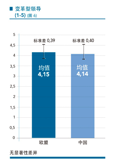 正如我们所预期的,中、欧两组创业者在行为上都具有较高的变革型领导水平(图6)。这进一步支持了“变革型领导”对于创新行为至关重要的理论。