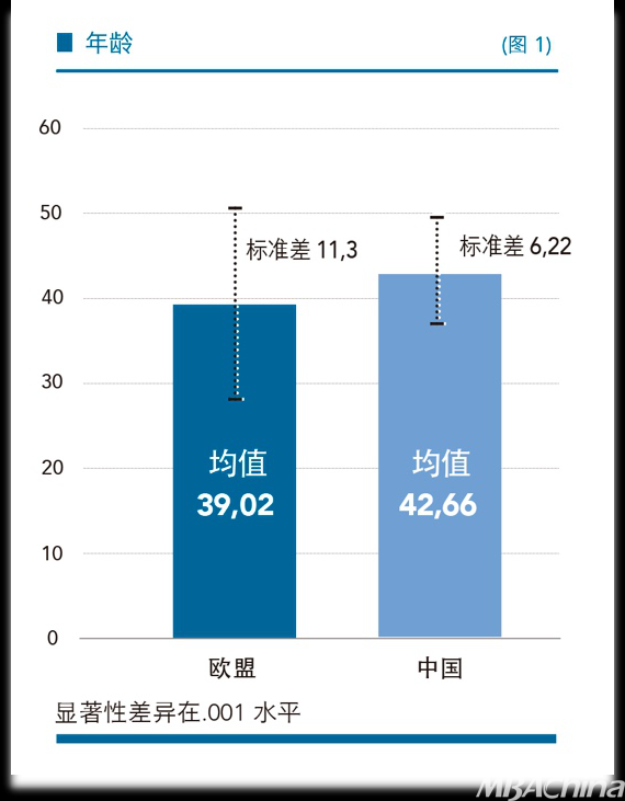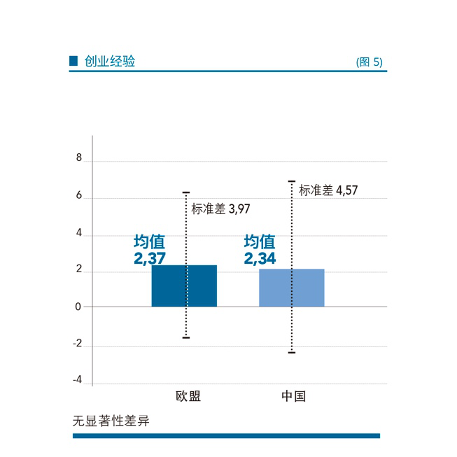 年龄和教育背景:我们发现,欧盟创业者要比中国同行年龄小得多(P<.001)。对于这一现象的可能解释是“教育”:中国创业者读研究生者更多,也即他们花在教育上的时间更长;但是,欧盟创业者却有更多的海外求学经历(P<.05)。