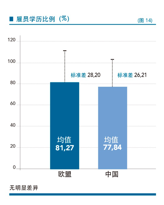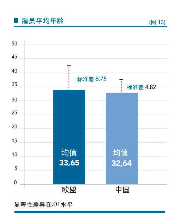 总体而言,中国创业者所雇佣的劳动力要比欧洲同行年轻得多(P< .01;图13):虽然中国劳动力市场年龄正在提高,但还是比欧洲年轻。