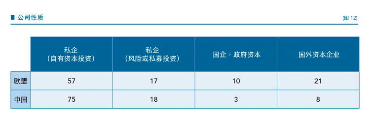 从所有权和资本来源来看(图12),中国初创公司通常为个人所有的私立公司,这一情况远高于欧盟。这一点很出乎人的意料,因为通常人们认为,中国政府才是初创者的主要投资方。这有可能要归因于文化差异,即中国创业者在采取风险规避,他们尽量避免外部资本进入并削弱他们对公司的控制。