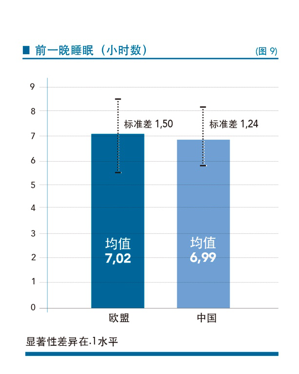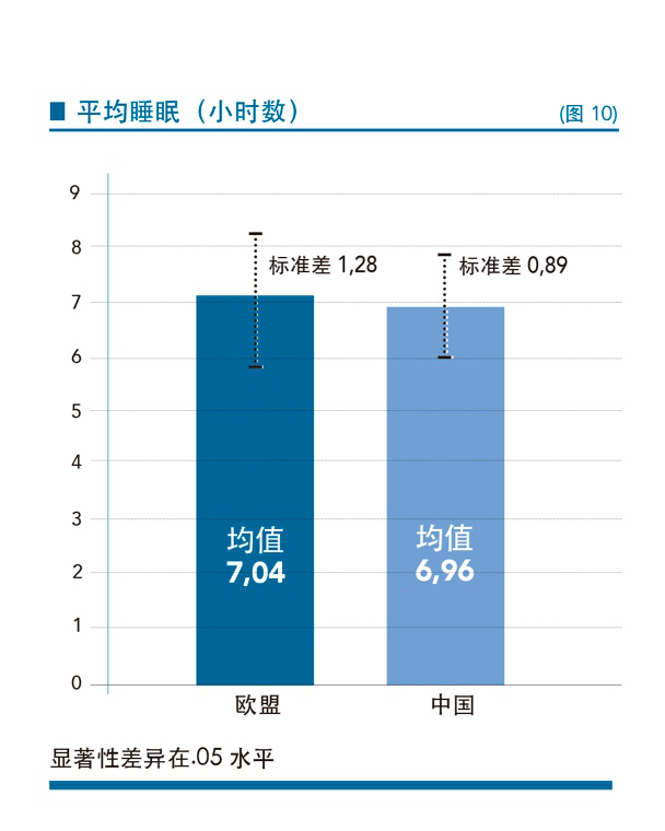 最后,我们的数据还显示,中国创业者群体睡眠时长少于欧洲创业者,这反映在两组数据上:1)调查前一晚的睡眠时间(P<.1;图9);2)每晚平均睡眠时间(P< .05;图10)。这似乎是在印证,中国人正在沿袭著名的硅谷创业文化中所强调的加班及长工作时间。