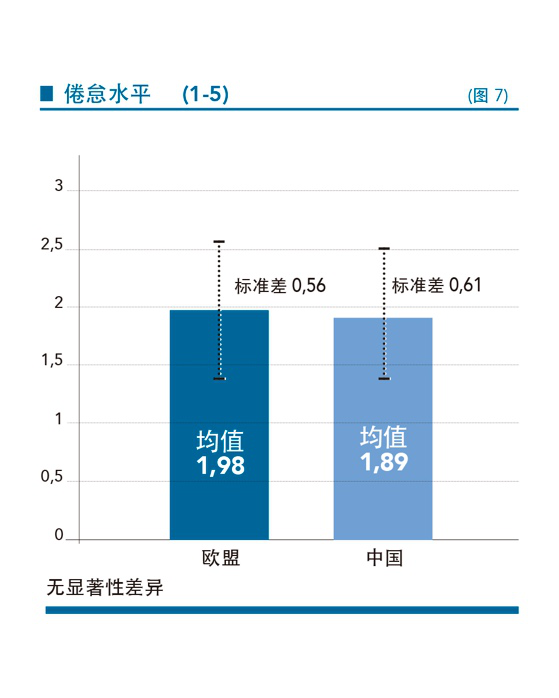 还有一点值得注意,那就是两组创业者都显示出较低的“工作倦怠”水平(图7)。这可能是因为,虽然创业者的工作压力通常较高,但他们积极性高,对工作充满热情,这种心理状态为他们的繁重工作设立了“缓冲”机制。