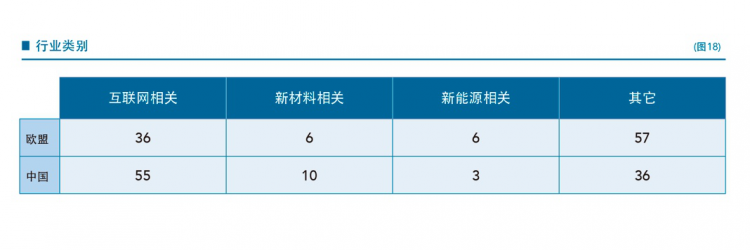 最后,欧盟创业企业更倾向于较传统的行业与部门;而中国新创企业则倾向于互联网与新材料领域(图18)。