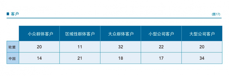我们所发现的另外一个差异是,两组企业所选择的客户群体不同(图17):欧盟创业者倾向于为个人提供产品和服务;而中国创业者则更倾向于企业客户。