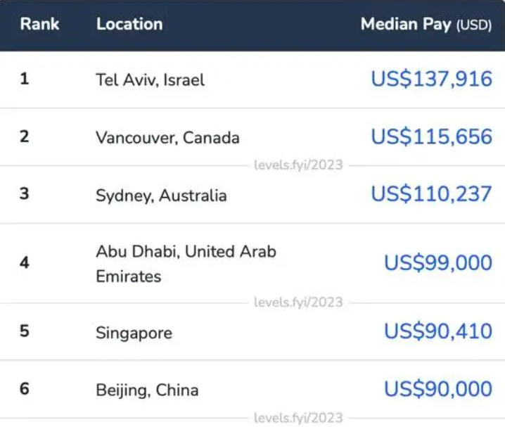而在“热门国际城市(排除美国)”中,程序员收入最高的地区为以色列特拉维夫,中位薪资为13.8万美元(当前约98.8万元人民币);