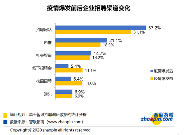 同时显而易见的是,从企业招聘渠道来看,招聘网站成为企业招聘人才的最主要的渠道;而类似线下招聘会、校园招聘等面对面为主的招聘渠道使用比例,受疫情防控影响而显著减少。