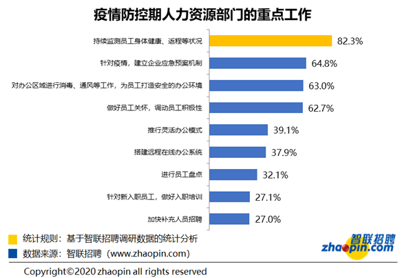 从此次智联招聘调查研究可以看出,各个企业面对疫情的来势汹汹,正在积极防控,并表现出对员工的人文关怀,更巧妙地借助人工智能、视频面试等高科技手段保障工作的有序开展,争取做到复工防疫两不误。