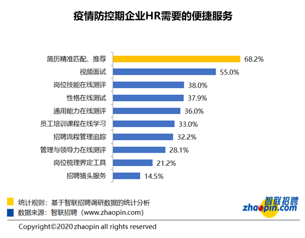 对此,本次调研还面向企业端征询了疫情防控期间对招聘平台的需求,不出意料,68.2%的企业希望平台提供简历精准匹配、推荐服务,55%的企业希望平台提供视频面试服务,其余高需求功能还包括岗位技能在线测评、性格在线测试等。