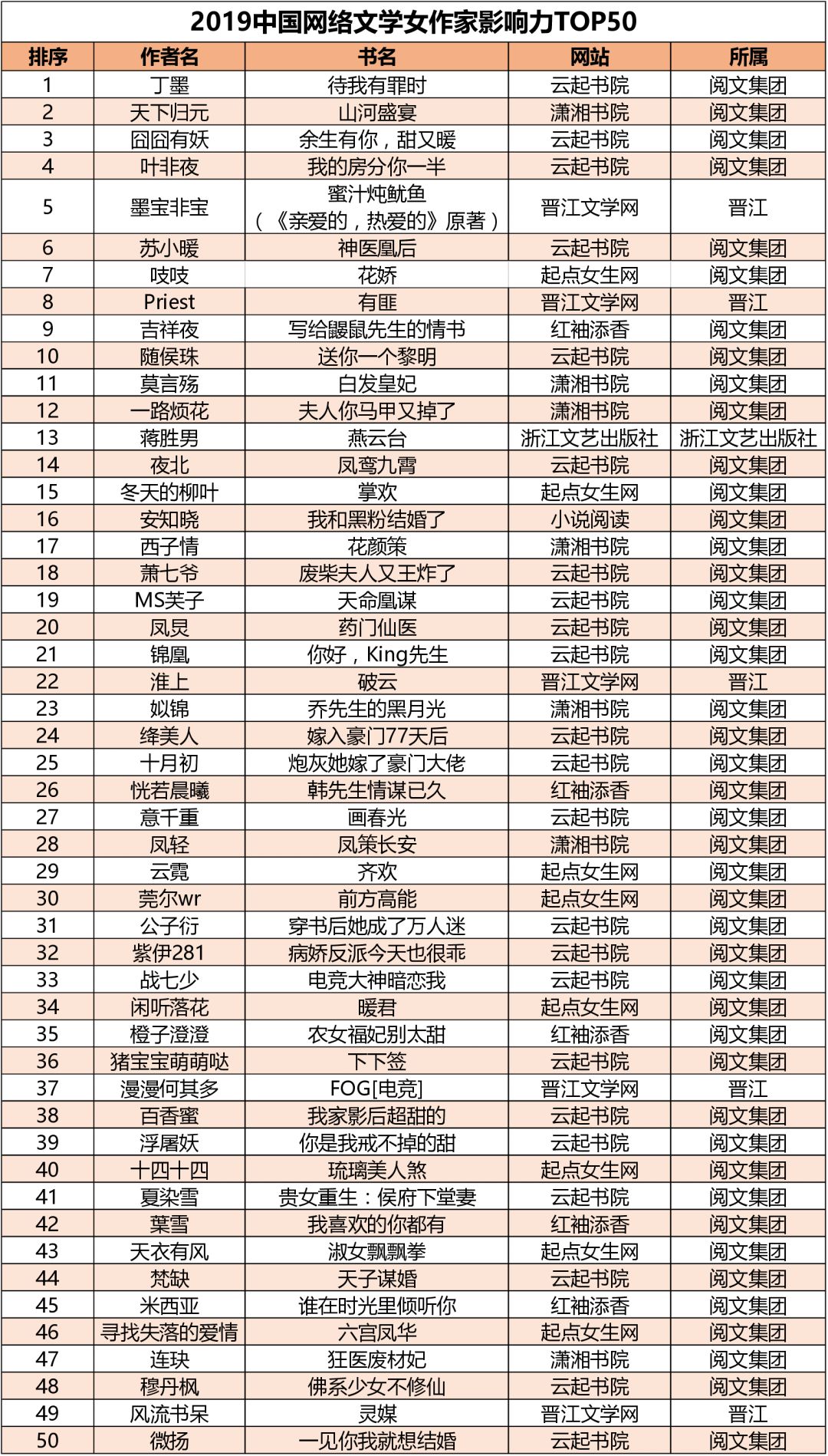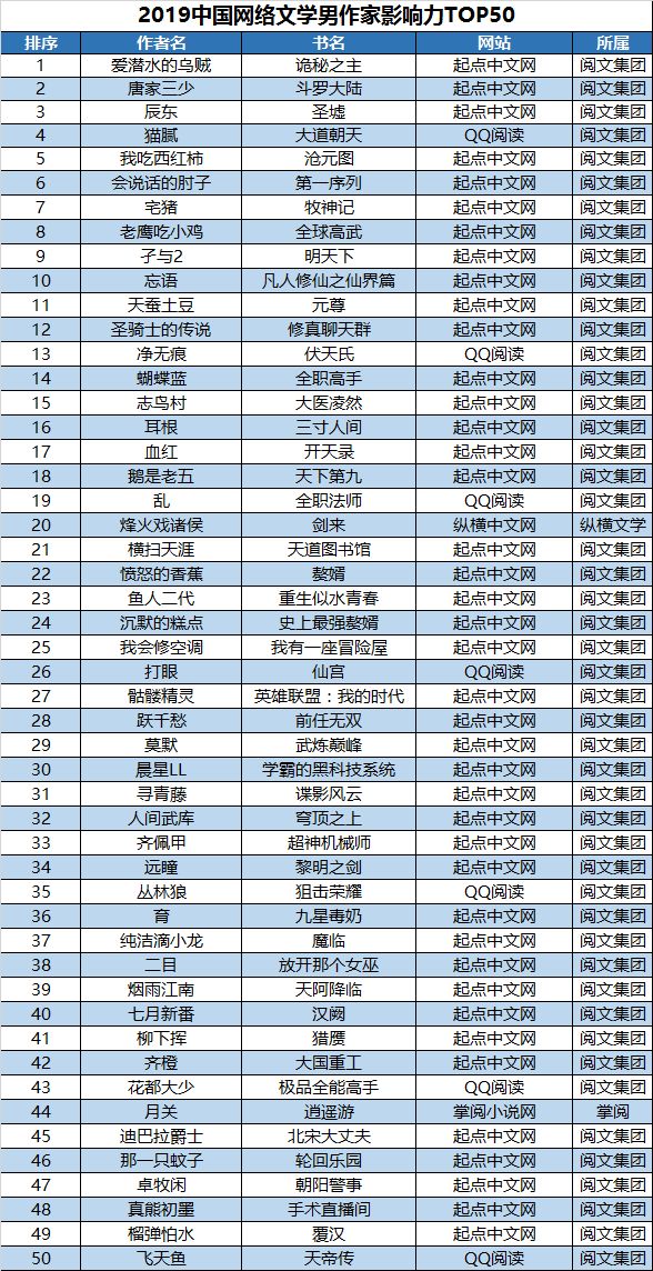 从速途研究院发布的“2019原创文学白金作家及大神作家”最新名单看,四百多位“白金作家”和“大神作家”青春正好,中生代作家领航崛起,新生力量快速上升。