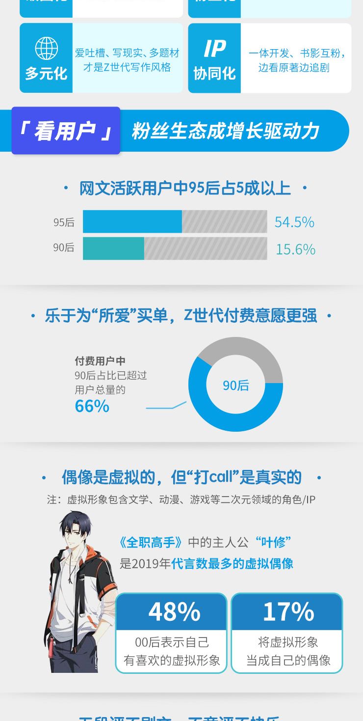 “网生代”正能量追星、感受二次元美好,用影音娱乐、阅读等方式构筑起他们独特的小世界,并在这个小世界里发现更好的自己。48%的00后表示自己有喜欢的虚拟形象(文学、动漫、游戏等二次元领域的角色/IP),17.2%将虚拟形象当成自己的偶像。陪伴“网生代”成长的《全职高手》是2019年代言数最多的虚拟偶像。虚拟偶像身上的一些特质,促使粉丝成为更好的自己,为他们“打call”的同时,也是自我成长与实现自己人生价值的过程。