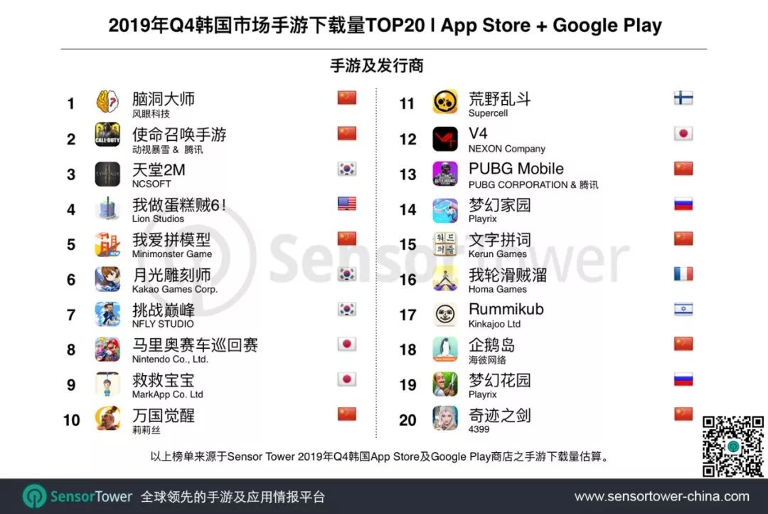 下载量方面,国产手游包揽前二,分别是《脑洞大师》和《使命召唤手游》。榜首《脑洞大师》Q4在韩国的下载量超过460万次,大幅超越同期其它手游;成为近年来韩国市场季度下载量排名第2的手游,仅次于《PUBG MOBILE》在2018年Q2获得的563万次下载。下载榜TOP20中,中国手游达到8款,较上一季度增加2款,是输出游戏数量最多的国家。