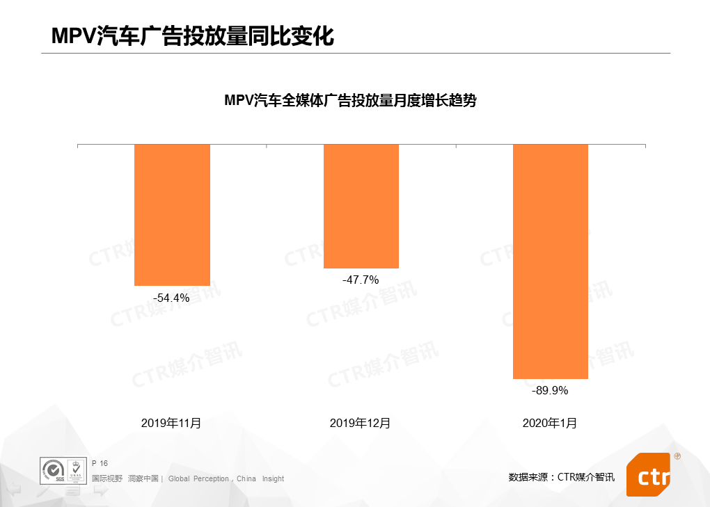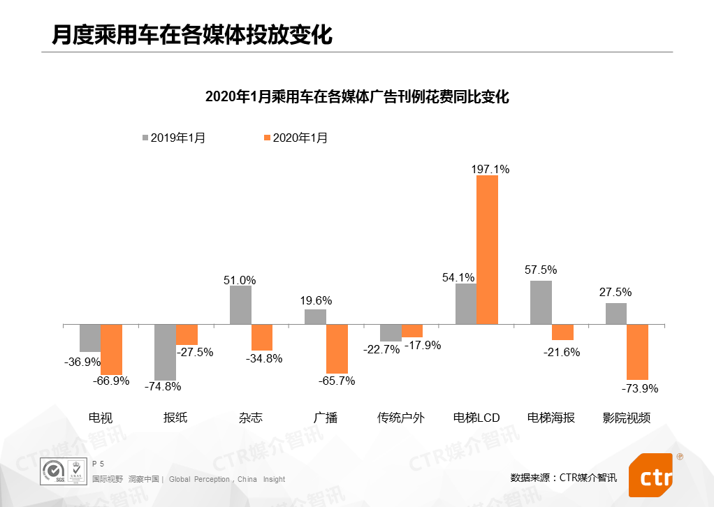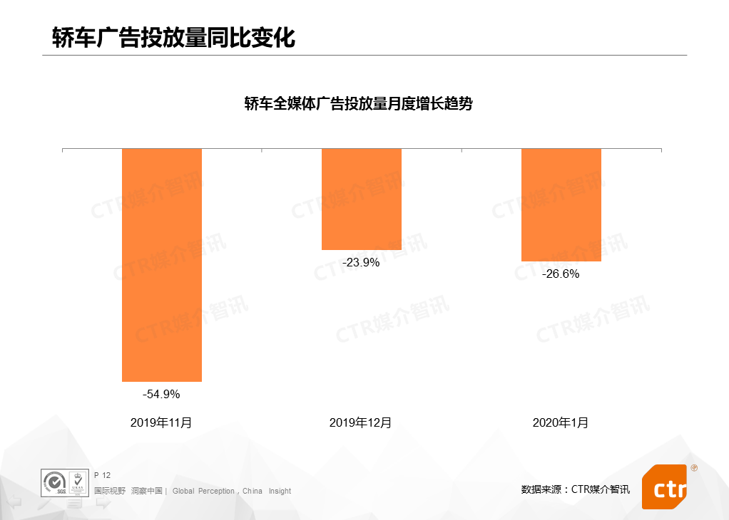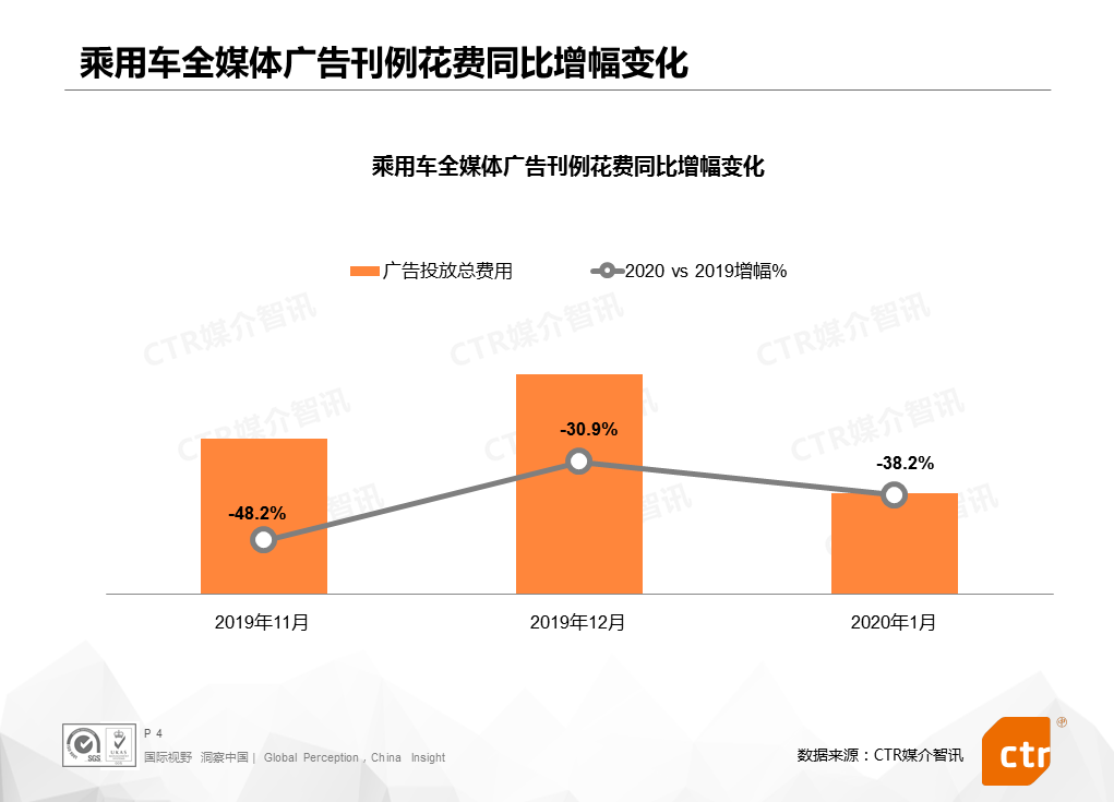 2020年1月乘用车广告投放刊例花费同比降幅略有扩大,达38.2%;环比呈现负增长,达54.3%。