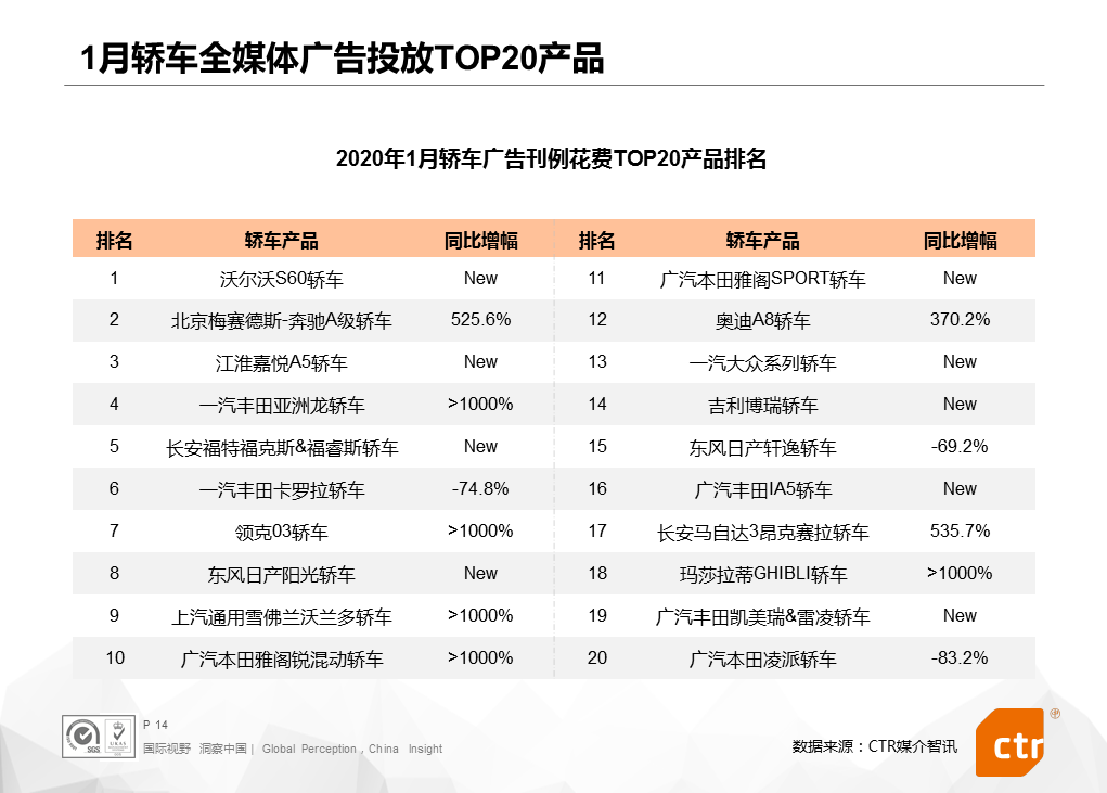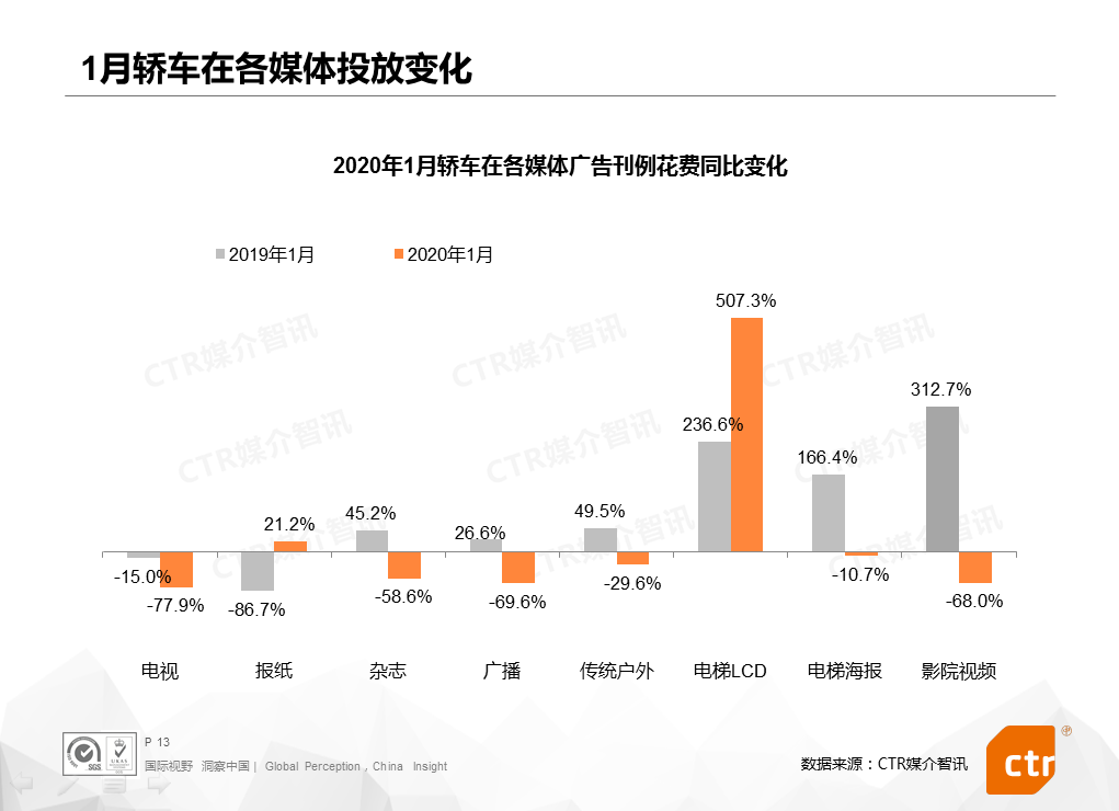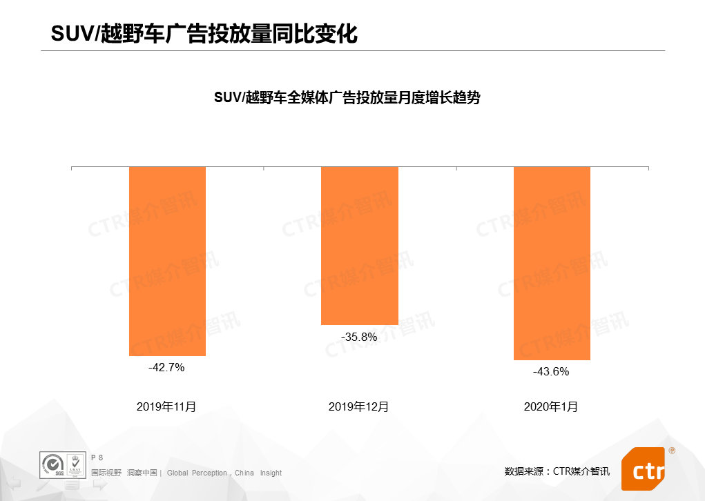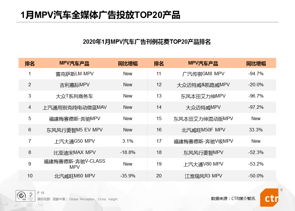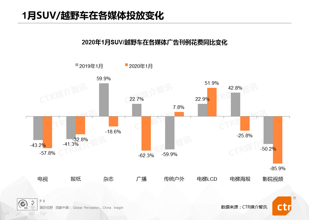 2020年1月乘用车广告投放刊例花费同比降幅略有扩大,达38.2%;环比呈现负增长,达54.3%。
