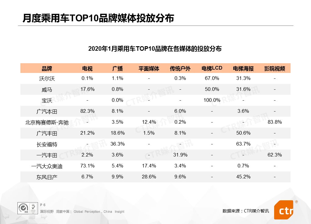 乘用车TOP10品牌中,位列前三甲的沃尔沃、威马和宝沃均着重在梯媒投放广告;排名第四、九位的广汽丰田和一汽大众奥迪则更倾向在电视媒体进行投放,花费占比超过70%。