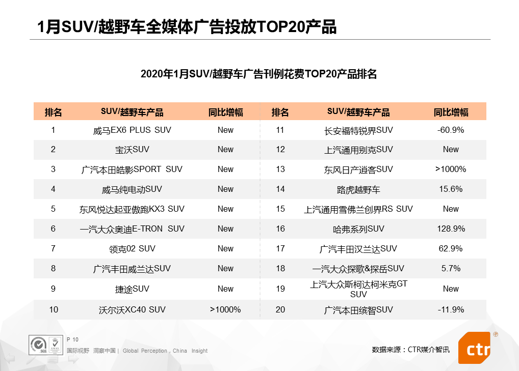 SUV/越野车 – 1月份SUV/越野车广告投放刊例花费同比跌幅达43.6%。仅在电梯LCD媒体的刊例花费呈现正增长,增幅为51.9%,主要是由威马系列SUV和宝沃SUV的大量广告投放拉动。TOP20产品榜单中,排名前九位的产品均是新上榜,榜中沃尔沃XC40 SUV、东风日产逍客SUV和哈弗系列SUV同比增幅抢眼。
