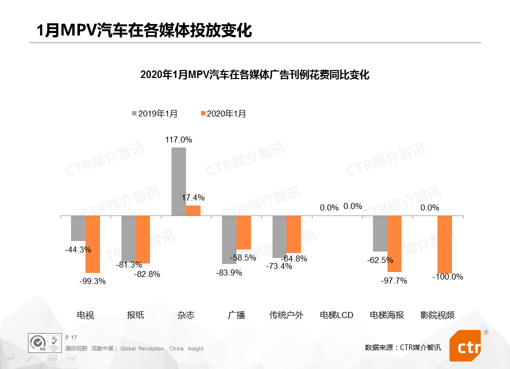 1月份乘用车广告投放仅在电梯LCD的刊例花费呈现明显的增长,增幅达197.1%,主要由沃尔沃S60轿车、威马系列SUV和宝沃SUV的广告助推增长;该行业在其他媒体的投放刊例花费均呈现二位数的同比降幅。