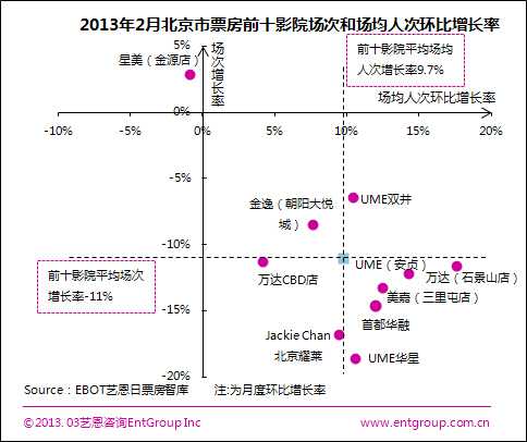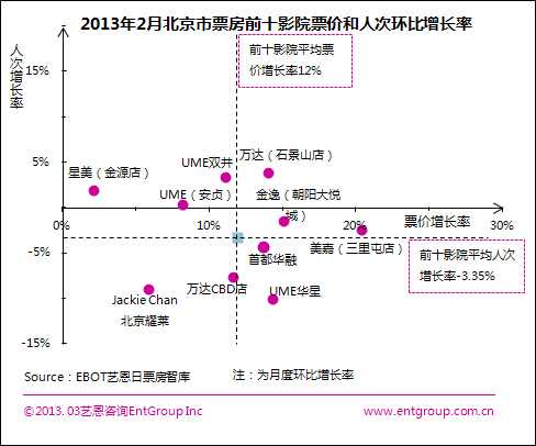 2013年2月万达影城(石景山店)在北京TOP10票房的影院排名中,票房环比增速最快,达到18%;美嘉影城(三里屯店)由于票价高增长率带动票房环比增速第二。长期的市场冠军,Jackie Chan北京耀莱以-1%的增长率位居末位。根据EBOT艺恩决策智库数据显示,2月北京市票房累计达到1.54亿,环比增长4.8%,观影人次336万。票房前九影院与上月仅是名次变化,美嘉欢乐影城(三里屯店)代替万达影城(龙德店)进入前十,前十影院票房累计占全市票房的35%。