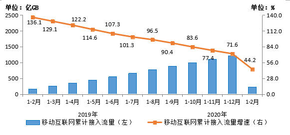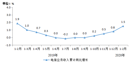 电信业务收入小幅增长。2020年1-2月,电信业务收入累计完成2242亿元,同比增长1.5%,增速同比回落0.4个百分点,但较上年末增幅提高0.7个百分点。按照上年不变价计算的电信业务总量完成2255亿元,同比增长19.7%。