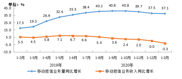 移动短信业务量快速增长,而收入同比下降。1-2月,全国移动短信业务量同比增长37.1%,增速同比提高19.8个百分点;移动短信业务收入完成57.6亿元,同比下降3.3%。