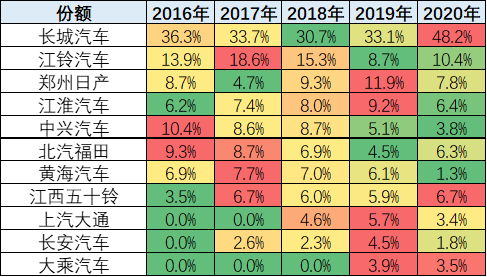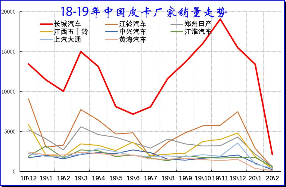 根据乘联会数据,2020年2月份皮卡市场销售5206辆,同比下滑82%,相对于2019年的2月增长21%,由于疫情因素导致今年同比下滑较大。