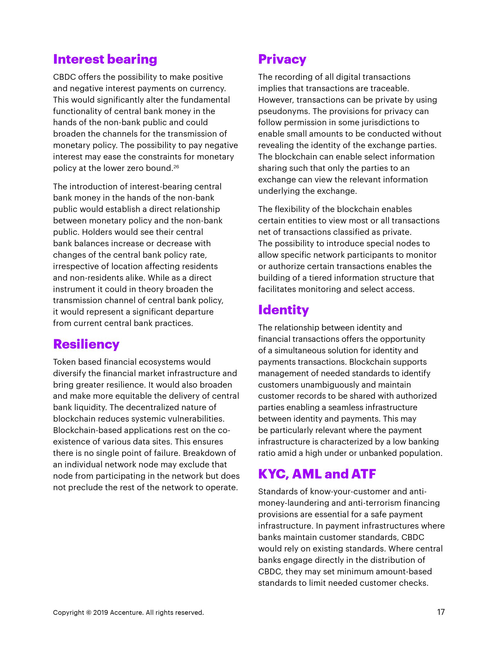 CBDC的最大好处可以在重塑支付关系的更广泛背景下找到,并且在资产和货币在单一分类账上的整合中,在标记化,分散化和安全信息共享的组合中。CBDC吸引零售,批发和跨境交易中的支付应用程序。考虑因素在很大程度上取决于当地情况和偏好。CBDC的采用将取决于既定的政策目标。