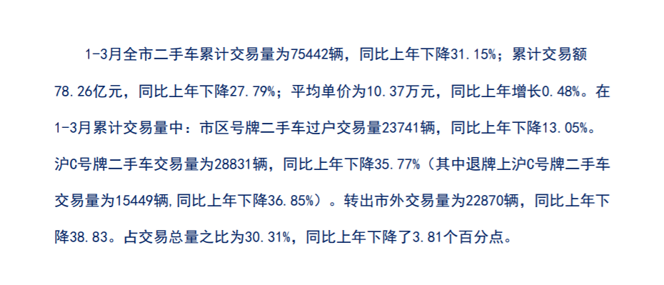 上海二手车协会:2020年1-3月上海二手车交易数据 今年1-3月份上海市二手车累计交易量为75442辆,同比下降31.15%。3月份二手车交易总量为41220辆,环比上月增长563.88%,同比上年下降11.90%,降幅较前两个月已经明显减缓。具体数据如下: 更多阅读:上海二手车协会:2019年1月上海二手车交易分析上海二手车协会:2019年1-9月上海市二手车交易分析上海二手车协会:2019年1-6月上海二手车交易分析中国汽车流通协会:2020年1-6月上海二手车交易数据分析上海二手车协会:2019年1-12月上海市二手车交易分析上海二手车协会: 2020年1-5月上海二手车市场分析上海二手车协会:2020年1-6月上海市二手车交易市场上海二手车协会:2020年1-2月上海二手车市场分析淘宝数据:2011年4月4日-10日淘宝牛仔裤交易数据上海二手车协会:2019年1-2月份上海二手车简报上海二手车协会:2019年1-7月上海市二手车交易分析上海二手车协会:2019年1-3月上海市二手车累计交易量109581辆,同比上年微增0.3%中国汽车流通协会:2023年6月及半年二手车深度分析中国汽车流通协会:2023年2月全国二手车市场深度分析中国汽车流通协会:2022年11月全国二手车市场深度分析