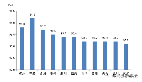 (一)体育场地设施数量与面积。调查数据显示,截至2019年底,全省共有各类体育场地设施183472个,与2018年相比增加10322个,增幅达到6%。体育场地设施总面积13702.65万平方米,与2018年相比增加729.61万平方米,增幅达到5.6%。人均体育场地面积2.34平方米,与2018年相比增幅为3.5%。平均每万人拥有体育场地设施31.36个,与2018年相比增加1.18个。其中杭州市体育场地设施数量最多、面积最大,分别为27955个、2176.9352万平方米,占全省体育场地总量的15.24%、体育场地面积总量的15.89%。湖州市人均拥有体育场地面积最多,为2.73平方米。