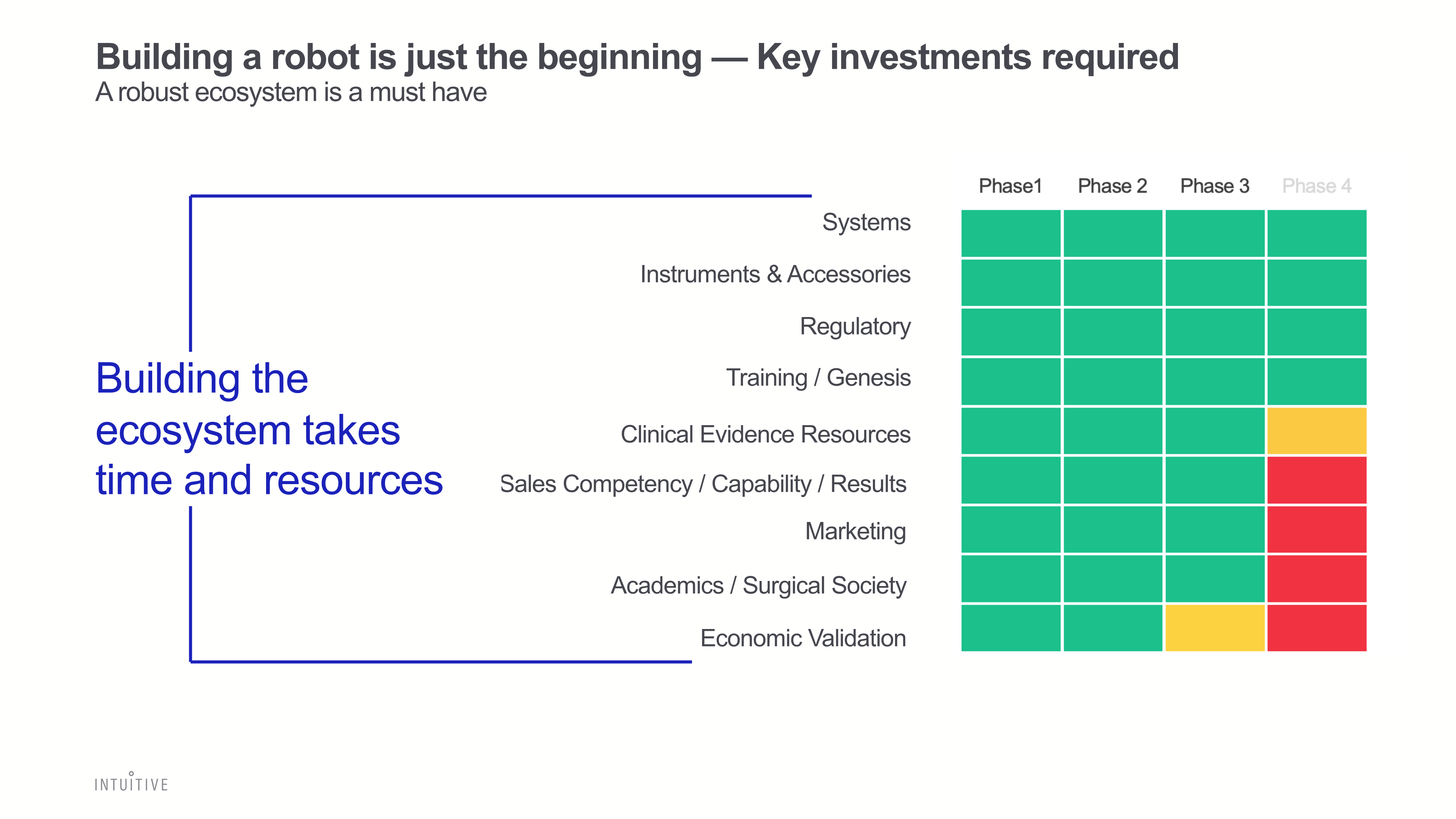 生产机器人只是一个开始,一个强劲的生态系统必须包括如下各个方面,如系统,仪器&附件,监管,培训,市场,经济验证等诸多方面。