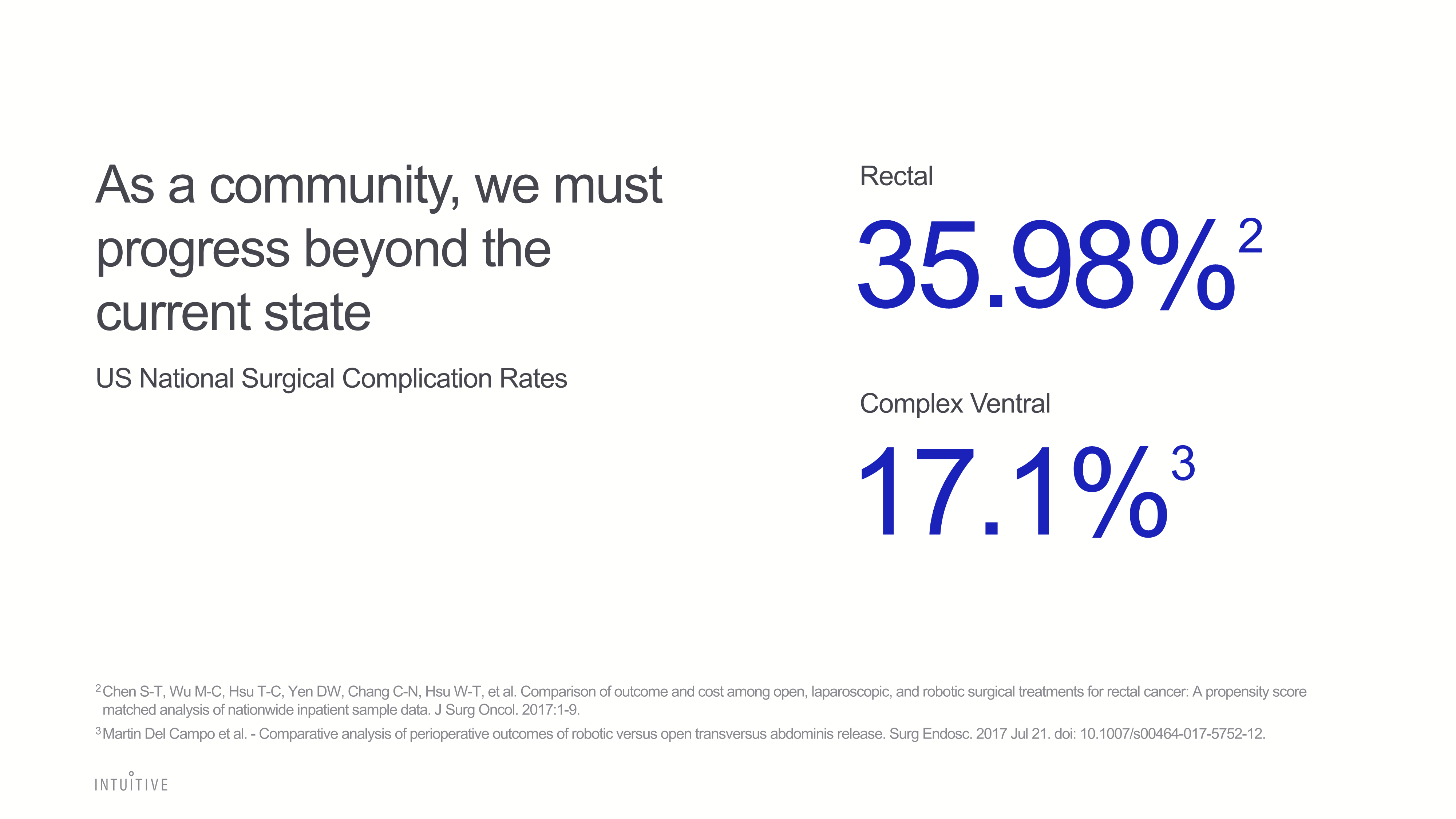 第一张PPT讲的是传统手术带来的并发症。众所周知传统的外科手术涉及到对人体开刀,受手术的复杂程度、医生技术精湛程度的影响,往往外科手术会导致并发症,并发症率居高不下。